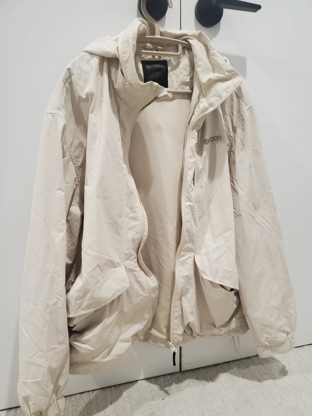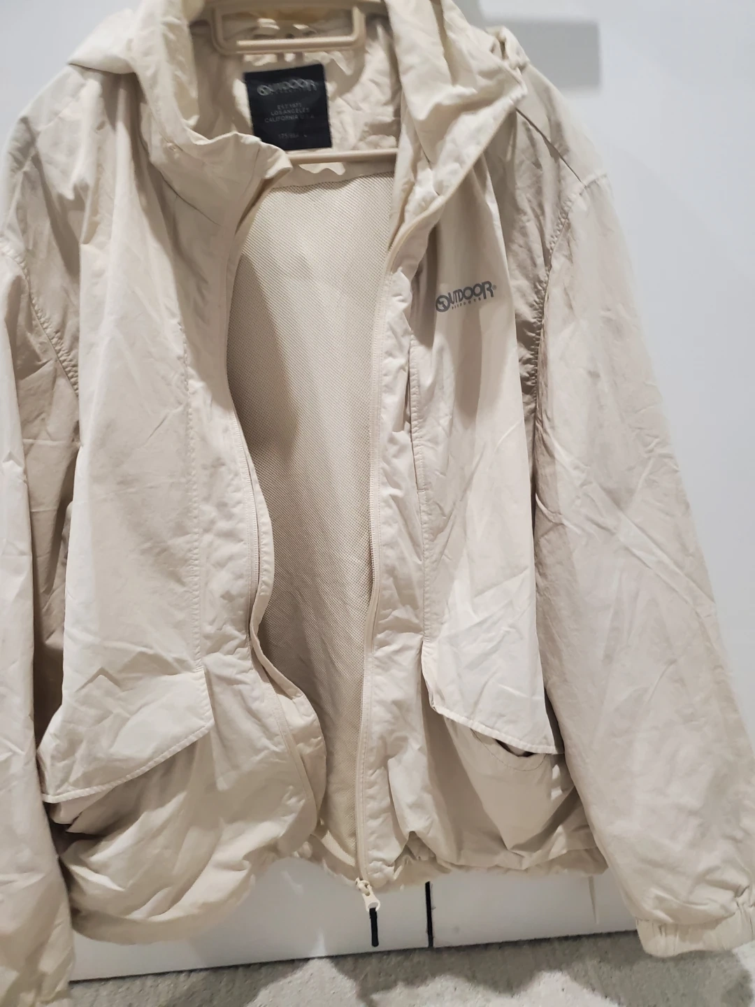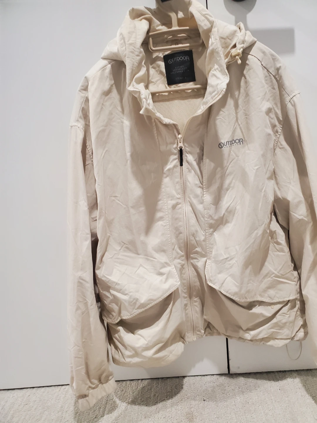 Here's a lightweight beige jacket from Outdoor Products! It's in great condition and ready for a new owner. Perfect for layering or wearing on its own during those breezy days