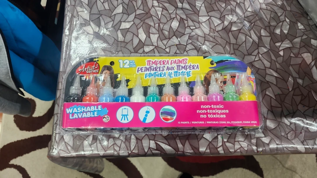 Selling a brand new sealed set of Artist's Series tempera paints! This set includes 12 different colours in easy-to-use bottles. They're washable and non-toxic, perfect for young artists