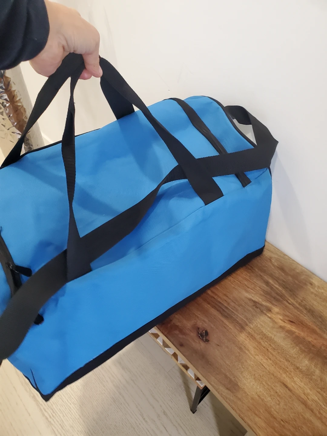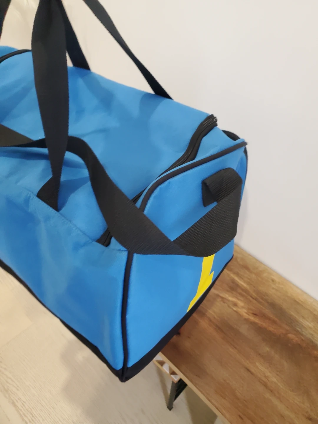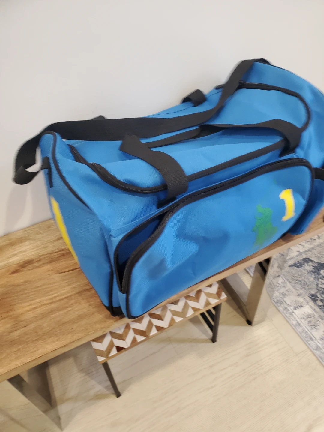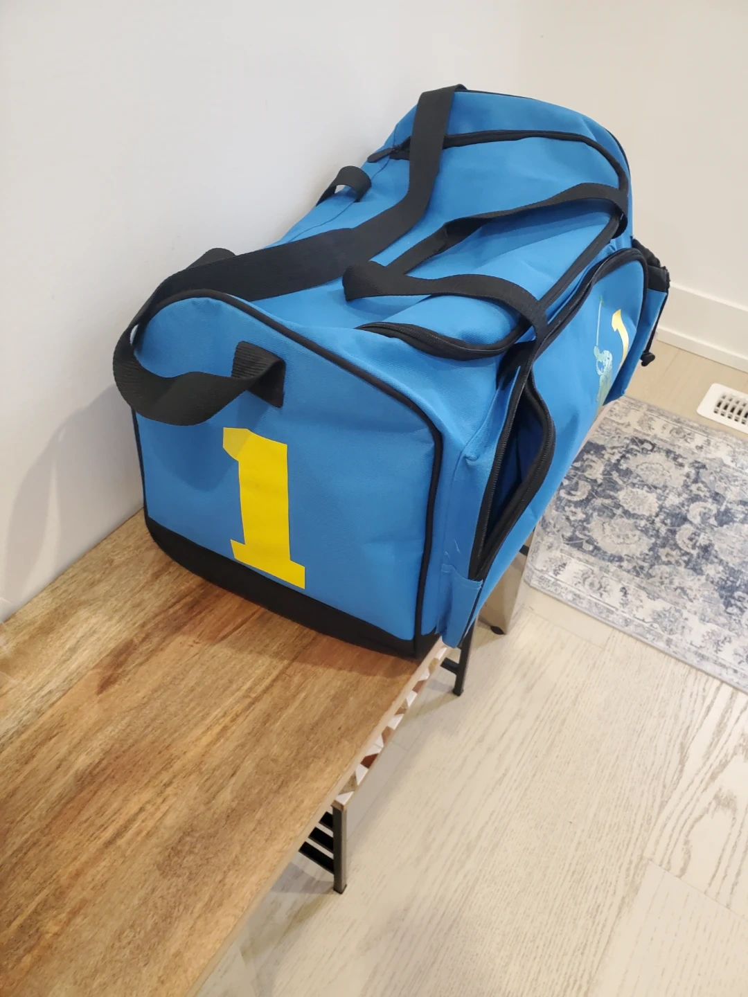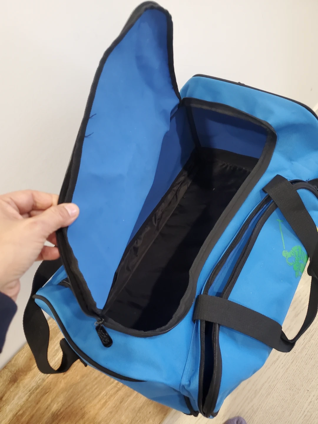 Here's a Polo Ralph Lauren duffle bag in a nice blue colour! It features black straps and a green logo with a yellow number 1. Perfect for the gym or a weekend getaway