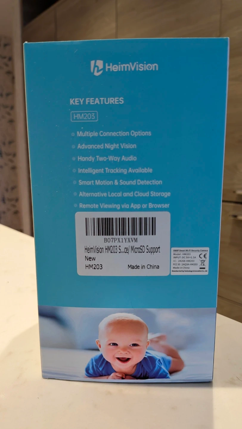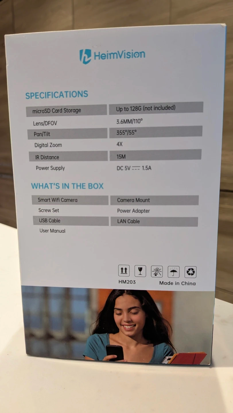 Selling a brand new HeimVision HM203 Smart WiFi Camera! It comes in its original box and includes all the components: camera mount, screw set, power adapter, USB cable, LAN cable, and user manual.