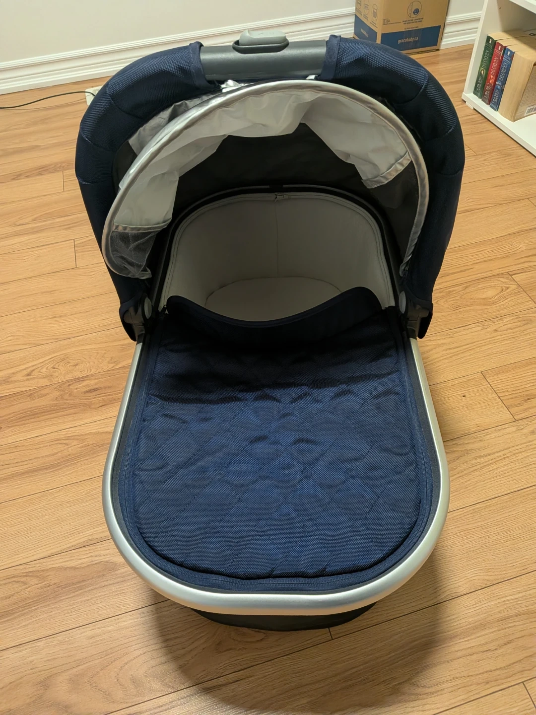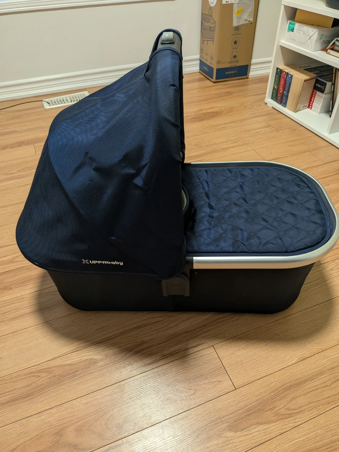 Selling an Uppababy bassinet in navy blue! It's in great condition and ready for a new little one. Perfect for strolls or naps!
