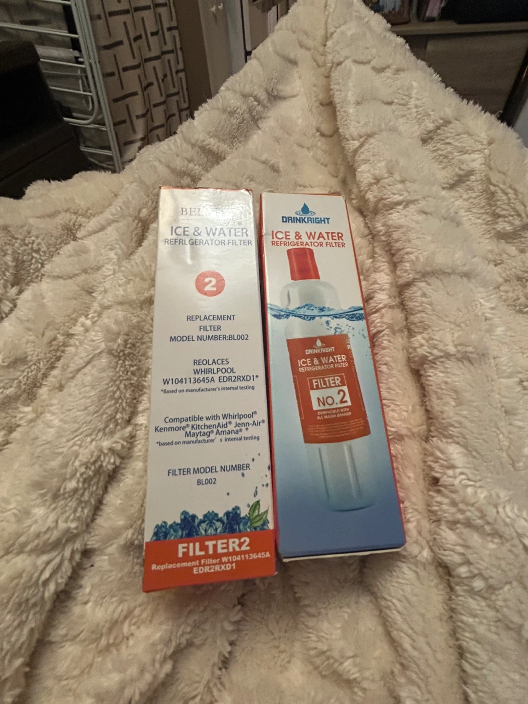 Selling two refrigerator water filters. One is a BEL Ice & Water RefRlgerator Filter, model number BL002. It replaces Whirlpool W104113645A EDR2RXD1 and is compatible with Whirlpool, Kenmore, KitchenAid, Jenn-Air, Maytag, and Amana refrigerators. The other is a DRINKRIGHT Ice & Water Refrigerator Filter, Filter No.2, compatible with all major brands