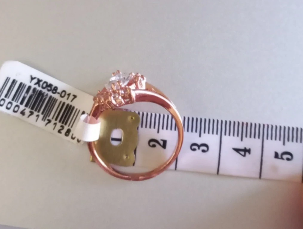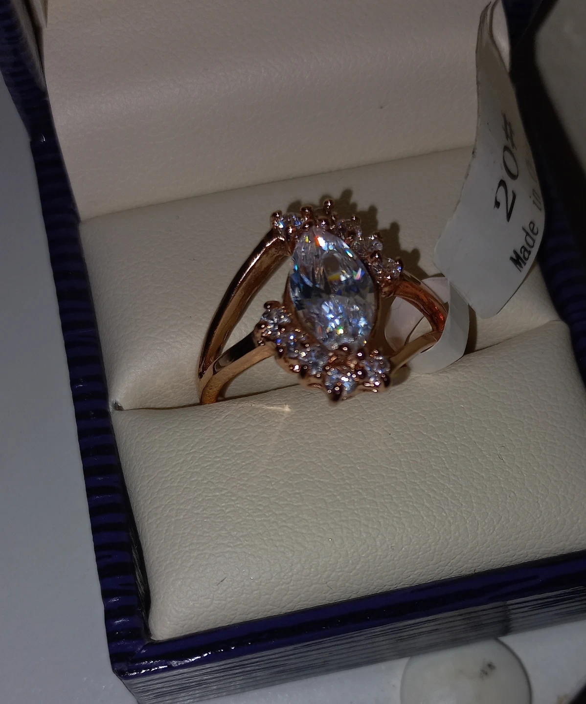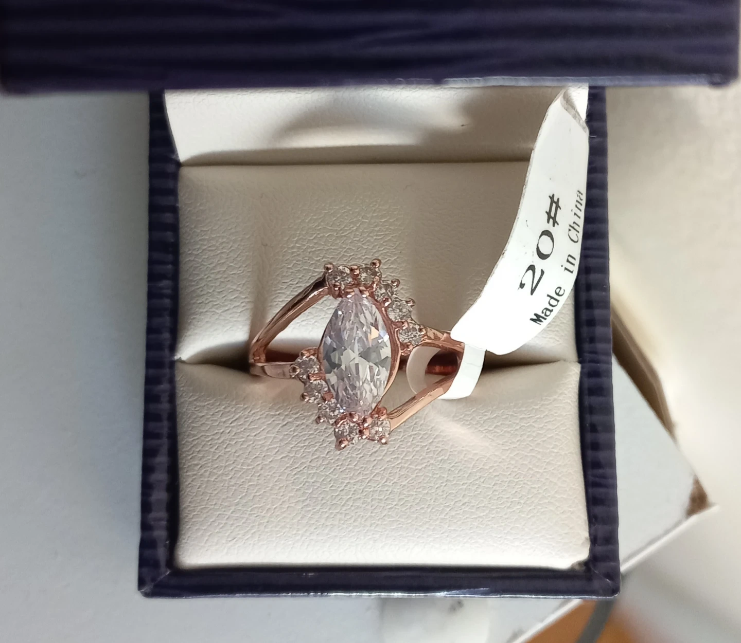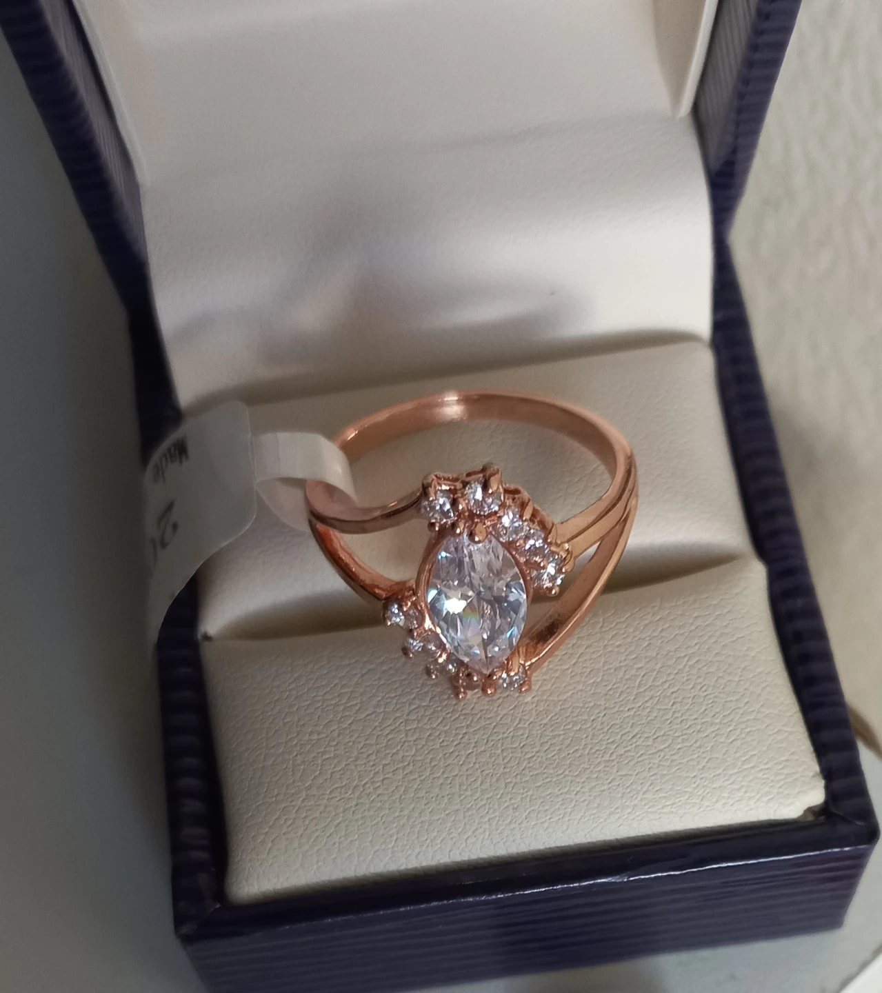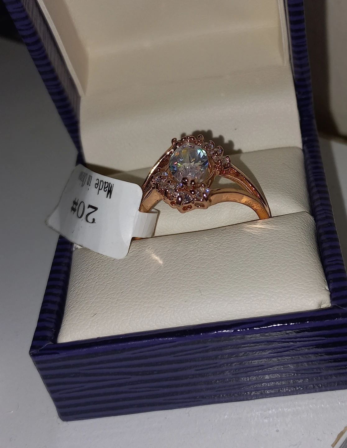 Rose gold ring featuring a central oval-cut cubic zirconia surrounded by smaller stones. It's a size (US): 7