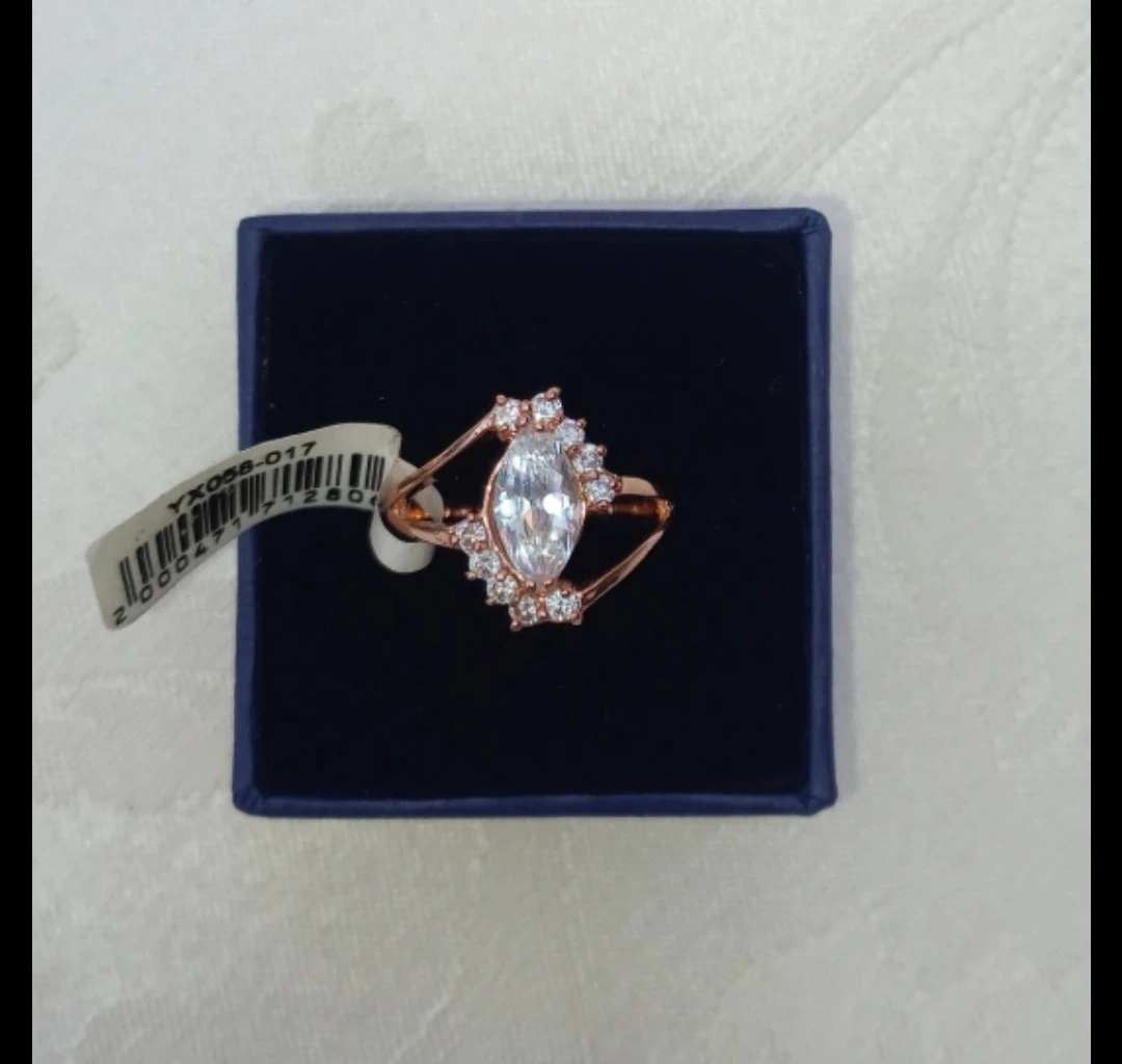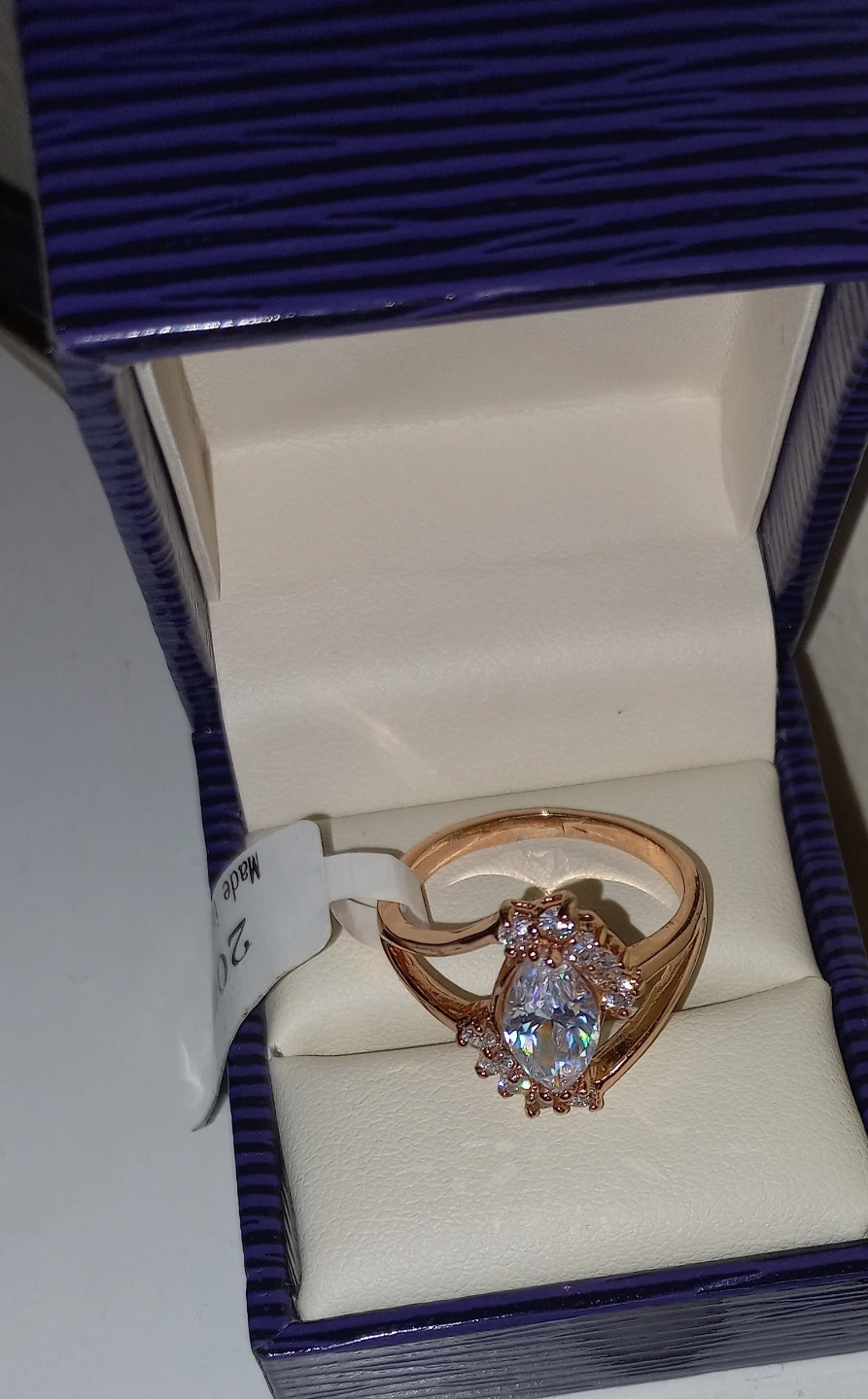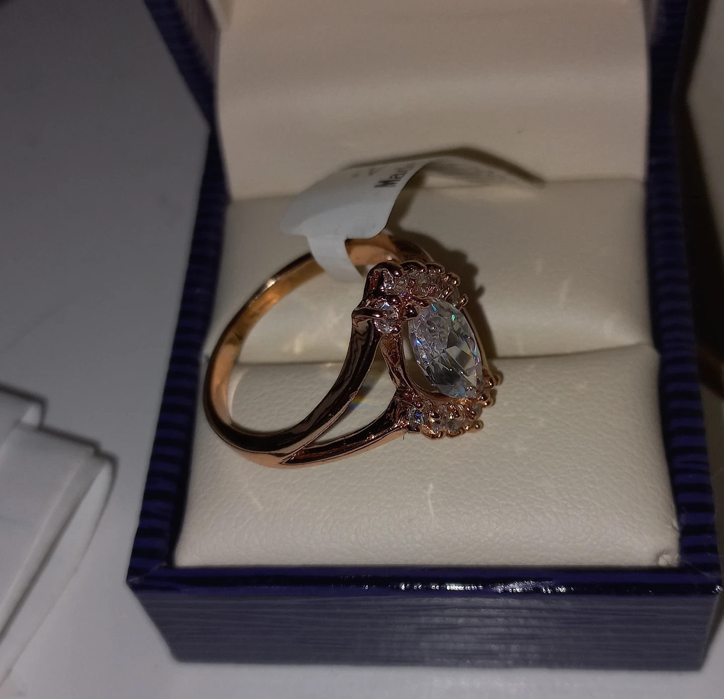 Rose gold ring featuring a central oval-cut cubic zirconia surrounded by smaller stones. It's a size (US): 7