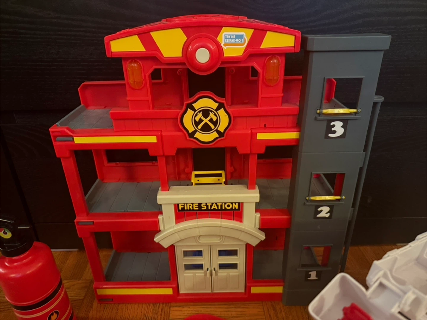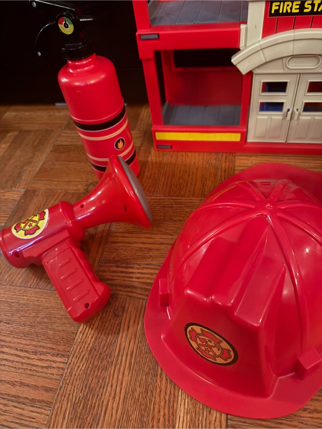 Fire station playset with a fire truck, fire extinguisher, megaphone, and fire helmet. Great for imaginative play!