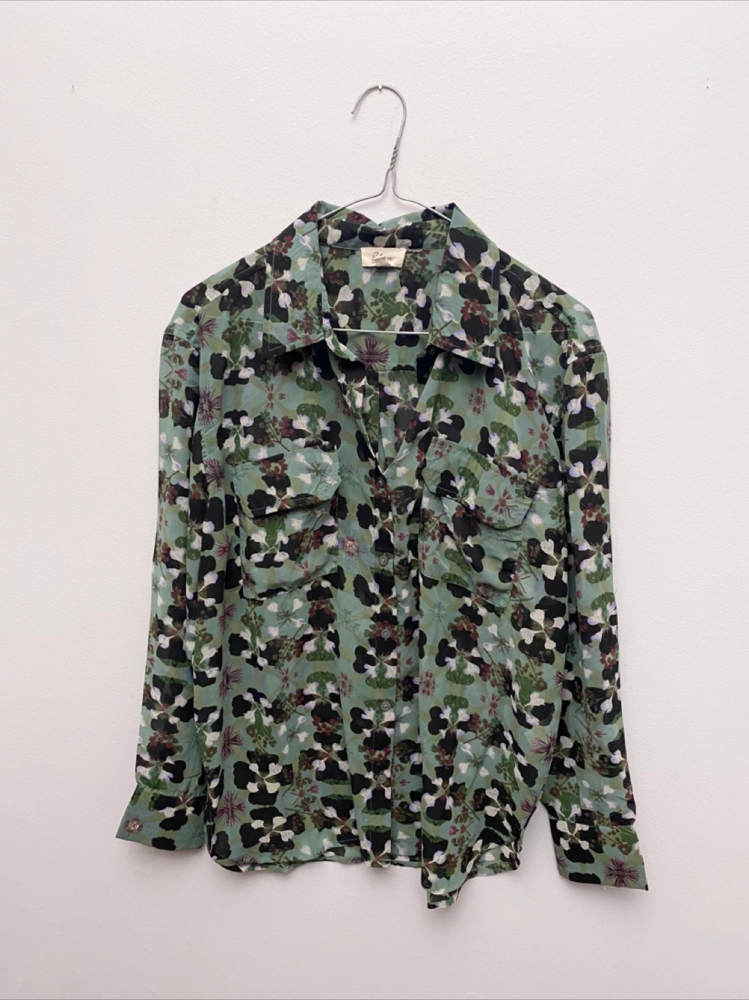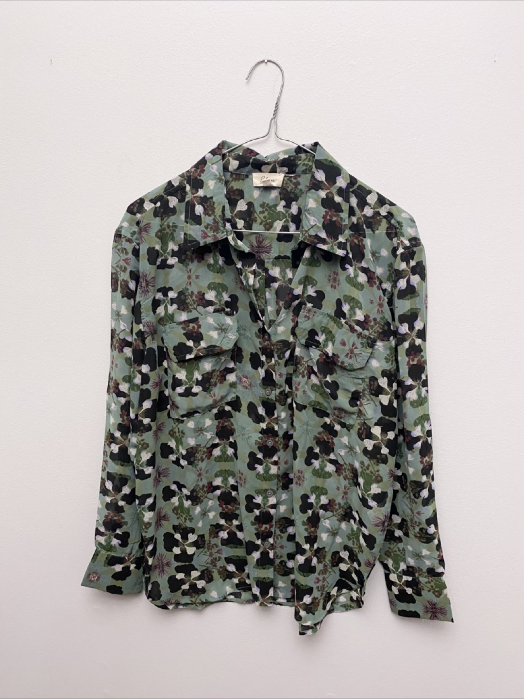 Here's a shirt with a unique floral print! It's perfect for adding a touch of style to your wardrobe. The shirt features a button-down style and two front pockets.