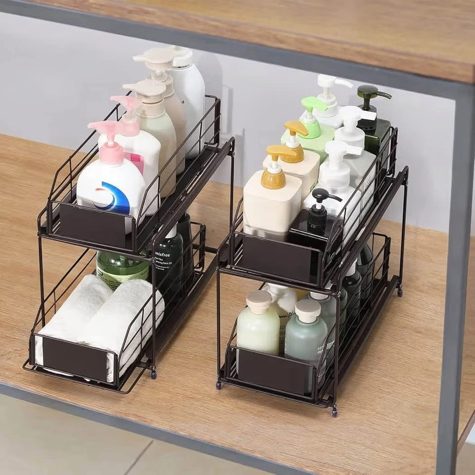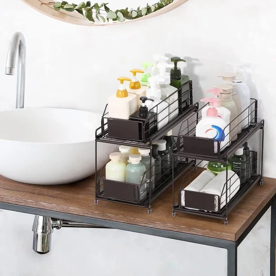 2 Tier Under Sink Cabinet Organizer, 2 Pack Stackable Cabinet Organizer with Sliding Storage Drawer (Brown)