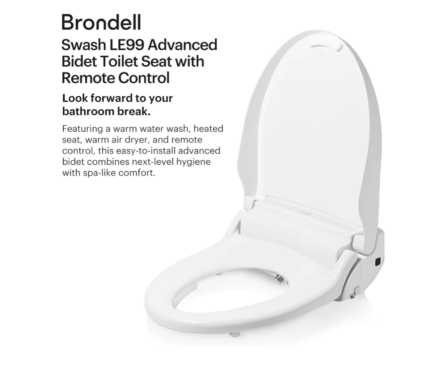 Selling a Brondell Swash LE99 advanced bidet toilet seat in round white. It features a warm water wash, heated seat, warm air dryer, and remote control for a spa-like experience in your own bathroom. The box is included!.