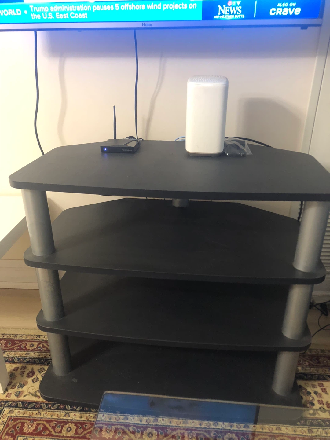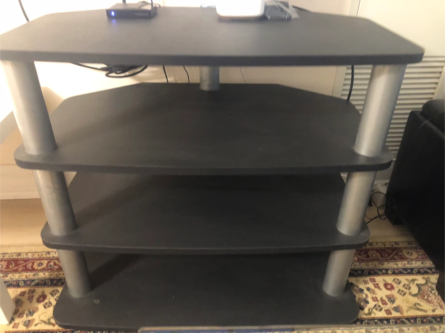 Selling a black corner TV stand with silver legs. It has three shelves, perfect for storing your media devices and accessories. It's in good condition and ready to use!