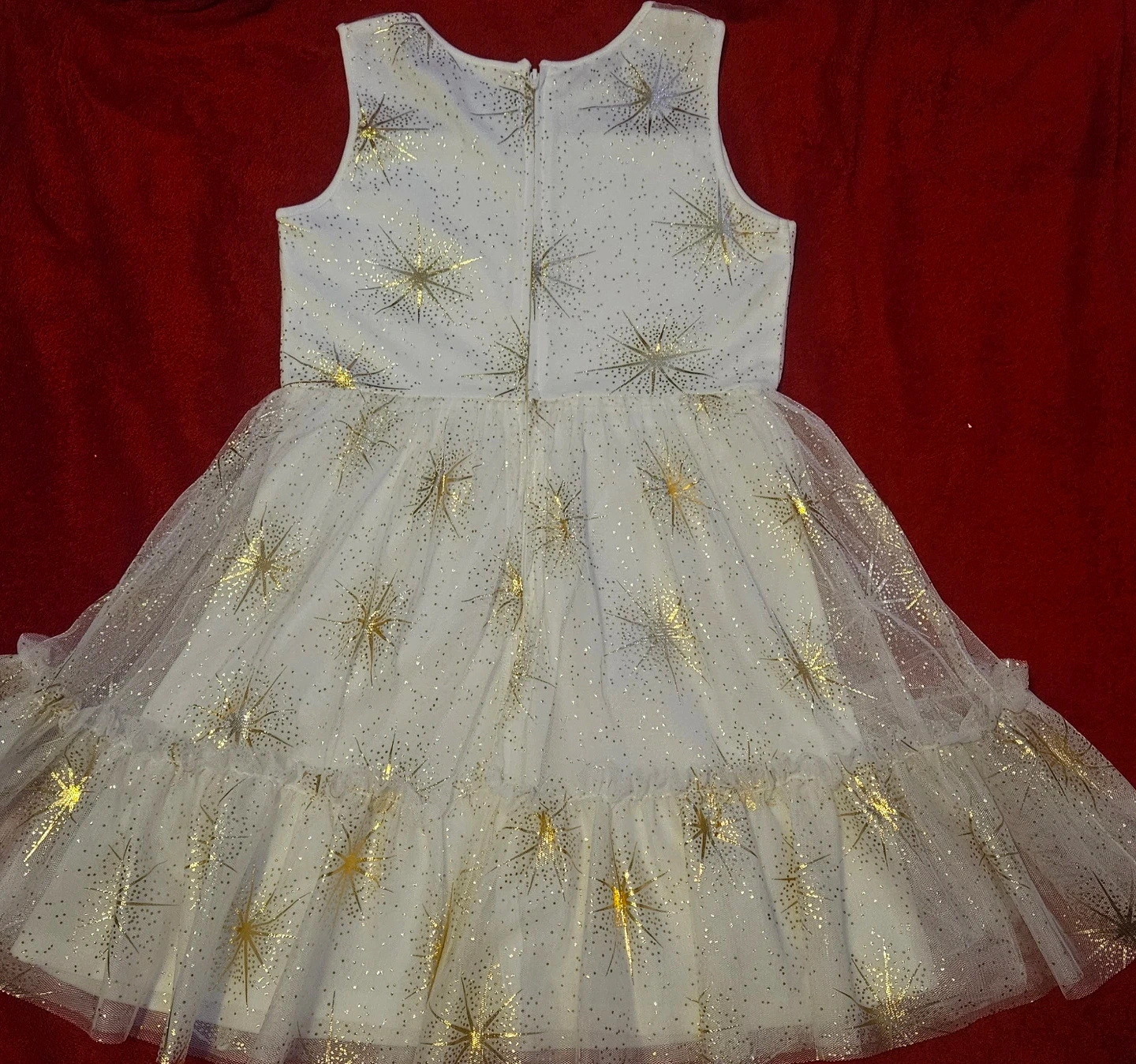This cute dress features a white bodice and layered skirt with gold star accents! It's in great condition and perfect for parties or special occasions