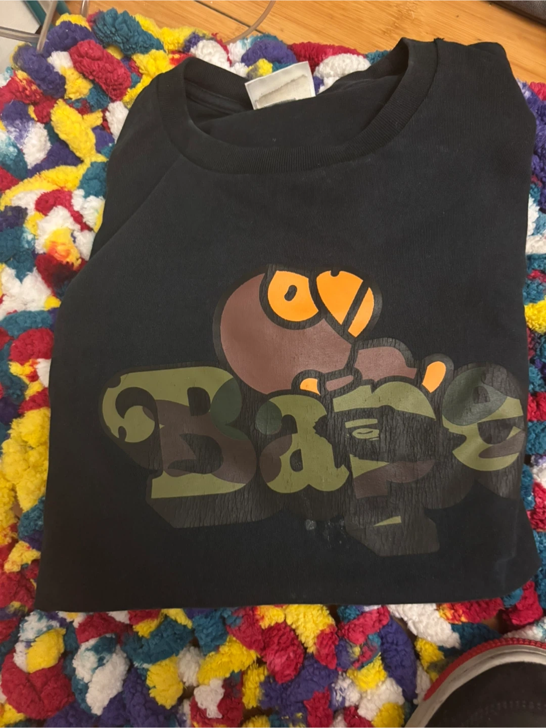 Selling a black BAPE t-shirt. The shirt features a distinctive BAPE logo with a camo pattern. It's in good condition and ready for a new owner!