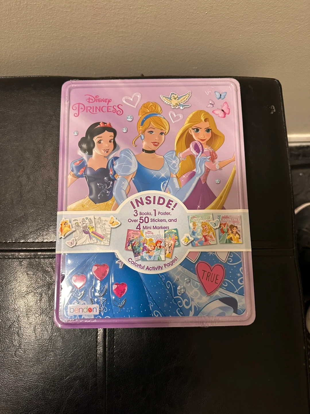 Selling a brand new Disney Princess activity tin by Bendon! It's a tin full of fun with 3 activity books, over 50 stickers, a marker, and a poster to colour in yourself! Perfect for ages 3+