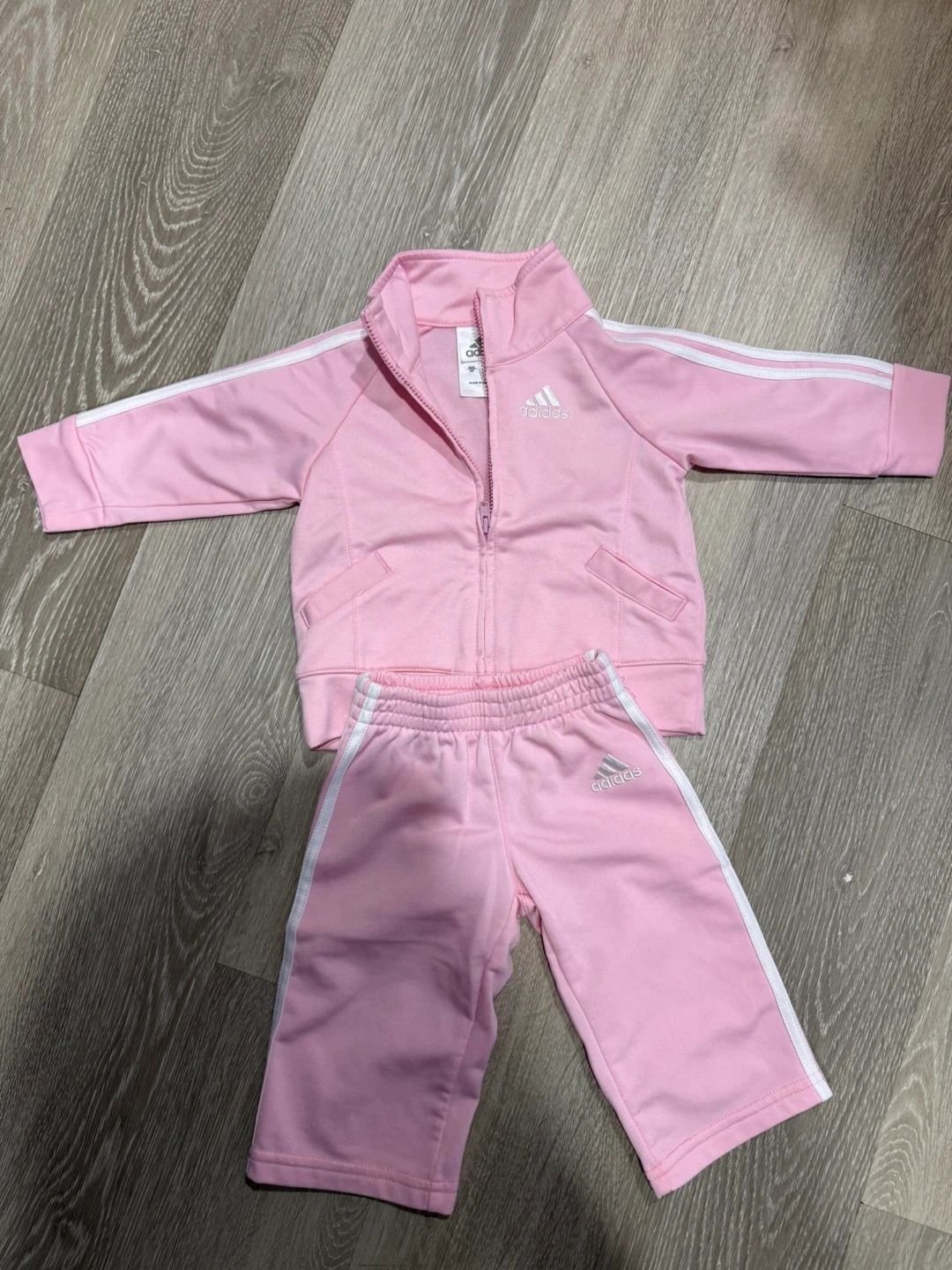 A cute Adidas baby tracksuit in pink! It includes a zip-up jacket and pants, perfect for keeping your little one comfy and stylish. The classic Adidas stripes add a sporty touch to this adorable outfit