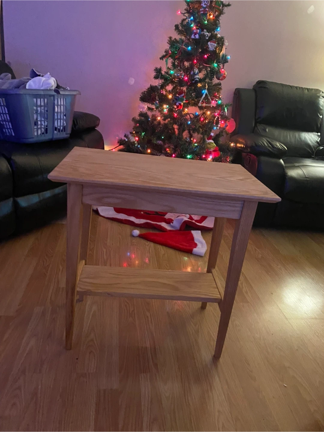 Selling a Hand Made oak side table. It's in great condition and perfect for a small space. It features a shelf for storage or display