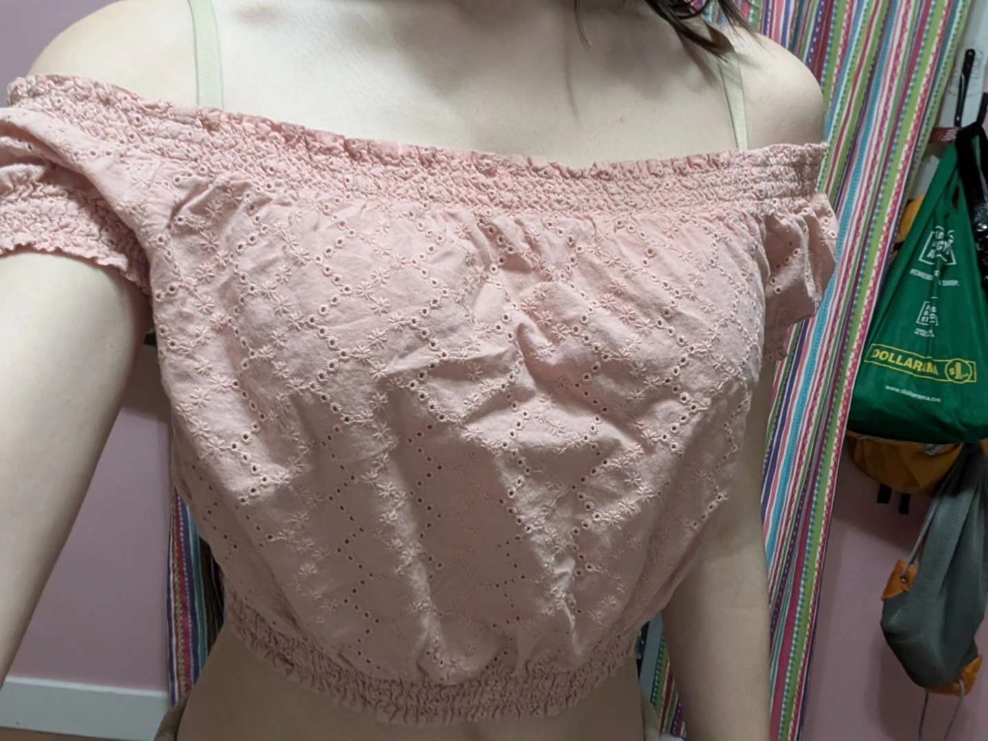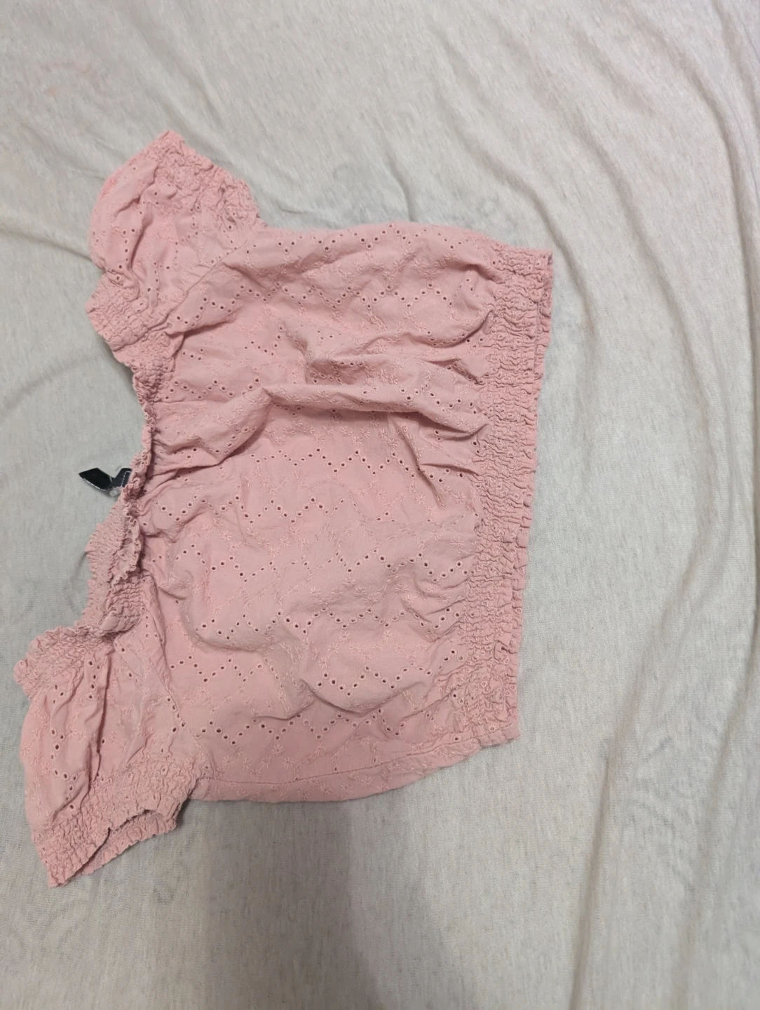 Selling a cute H&M Divided off-shoulder crop top in a lovely pink colour. It's a size 4 and features a delicate eyelet pattern. Perfect for a casual summer look!
