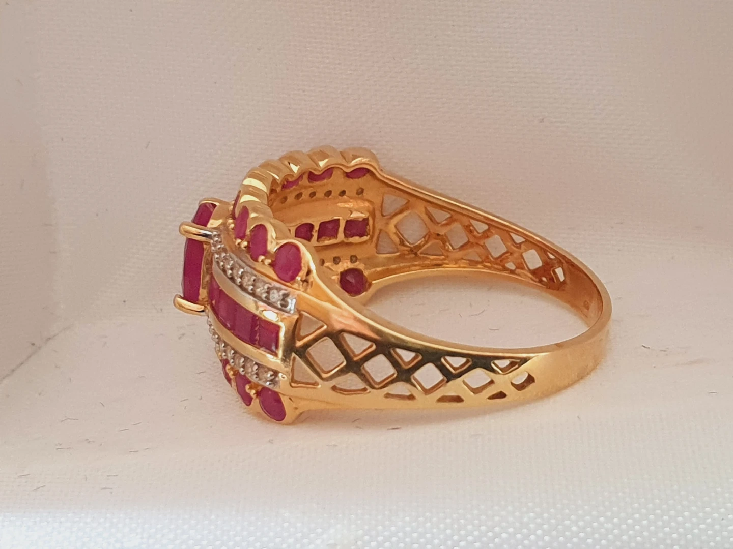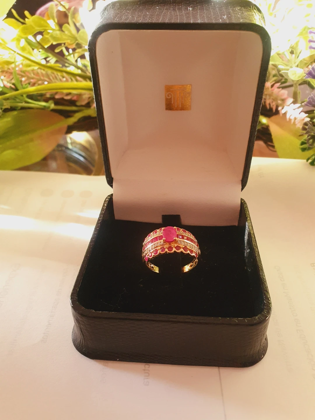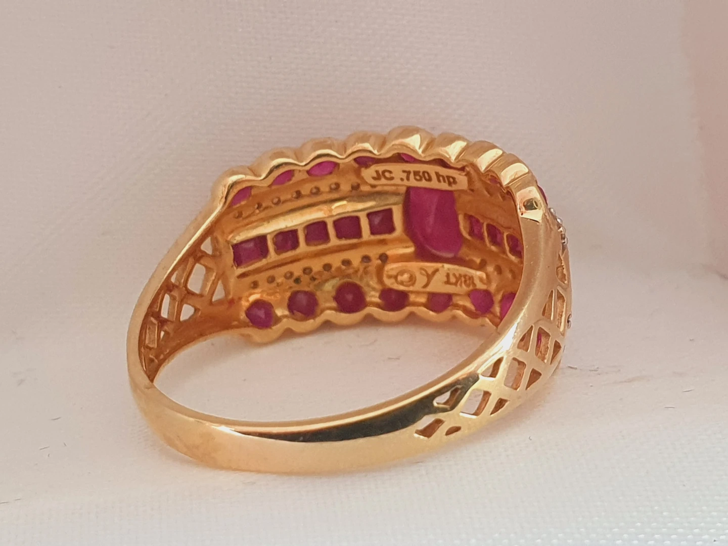 Selling a beautiful gold ring adorned with vibrant rubies. The ring is size 9 and marked with 'JC .750 hp'. It comes in its original box.