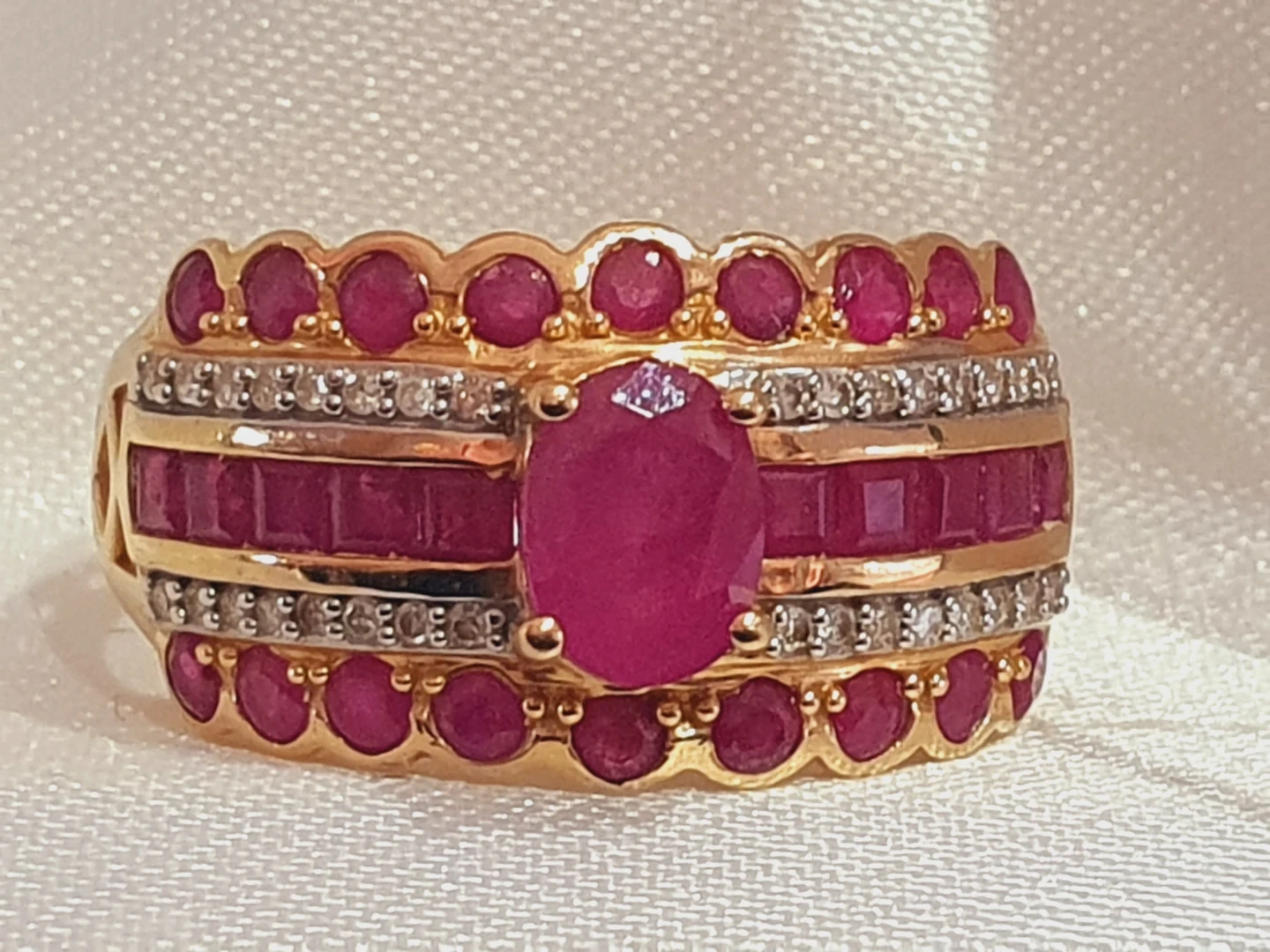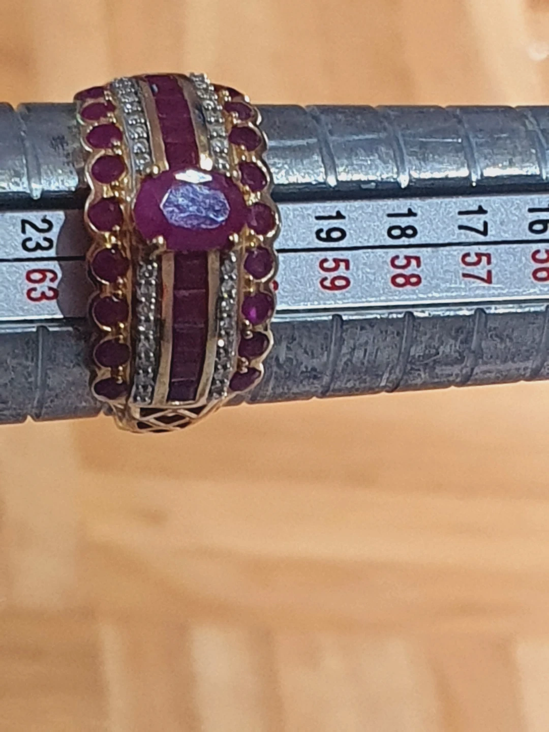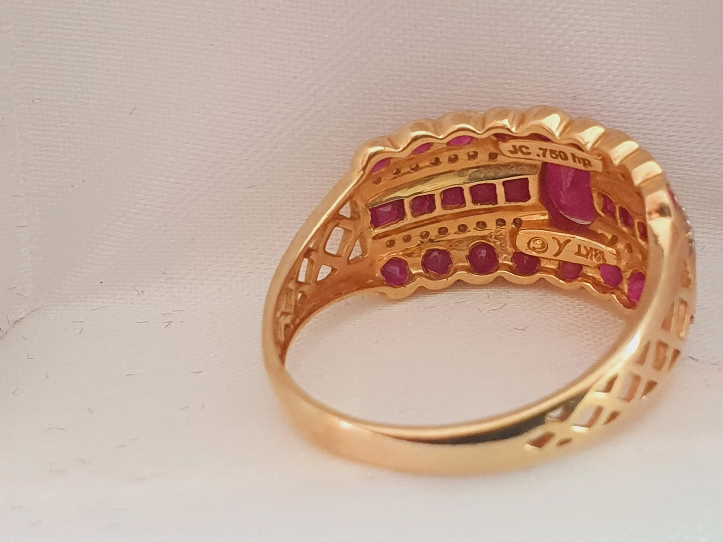 Selling a beautiful gold ring adorned with vibrant rubies. The ring is size 9 and marked with 'JC .750 hp'. It comes in its original box.
