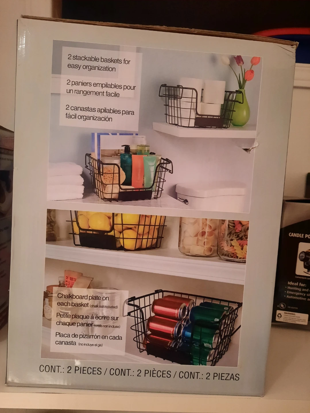 Selling a set of two stackable baskets, perfect for organizing your kitchen or pantry! They're great for storing fruits, vegetables, canned goods, or other household items.Each basket has a chalkboard plate (chalk not included) so you can label the contents.