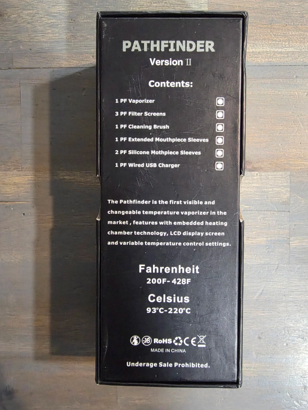 The Pathfinder features embedded heating chamber technology, an LCD display screen, and variable temperature control settings