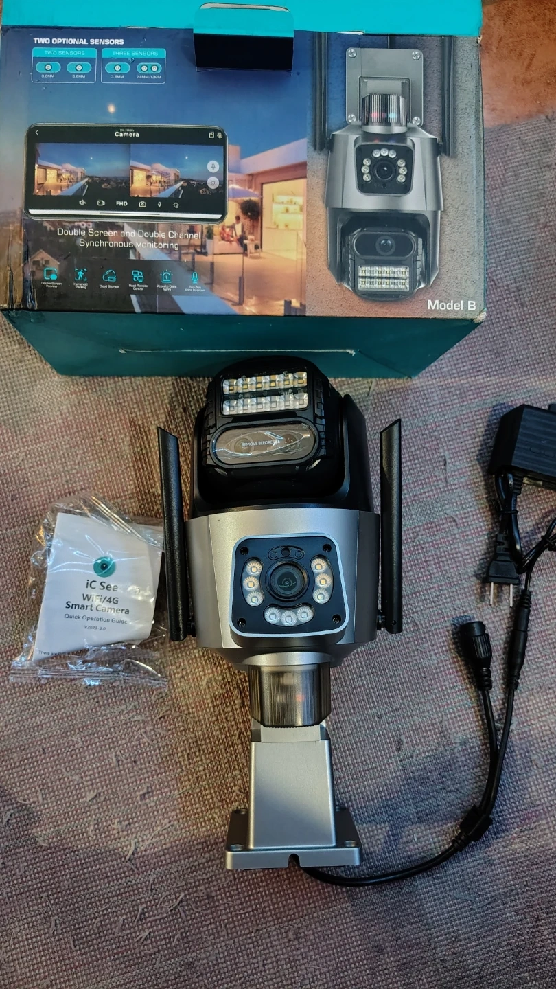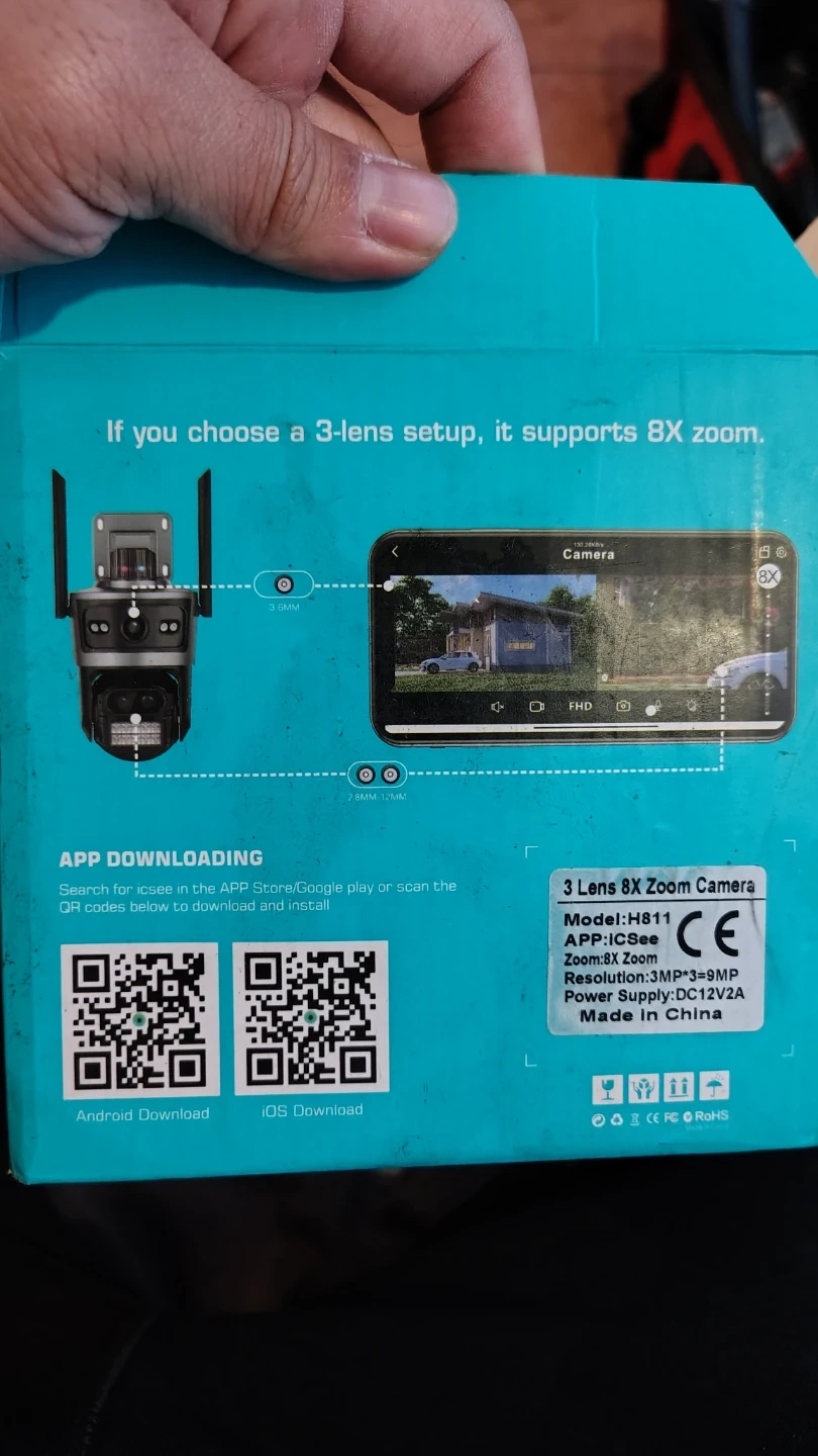 Selling an ICSee H811 3 Lens 8X Zoom Camera. It comes with the box and components, including the power supply and instructions. The camera features 8X zoom and supports a 3-lens setup. It also has dual screen preview synchronous monitoring.