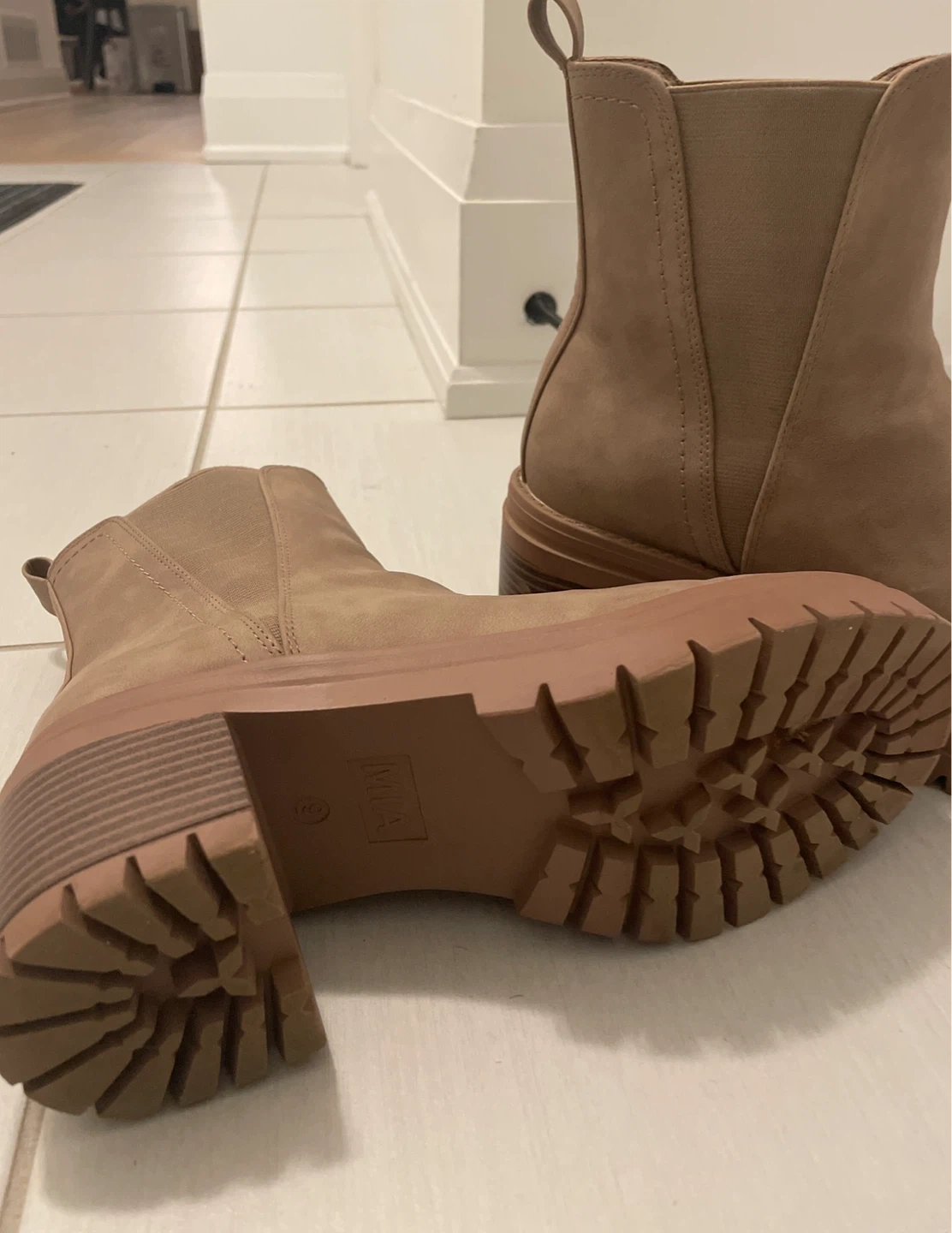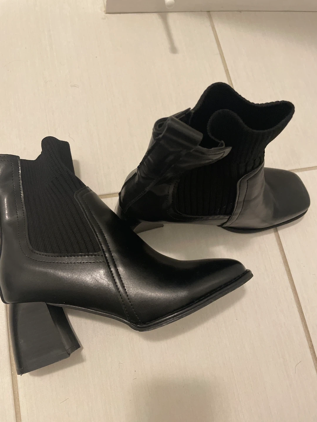 Selling a pair of boots. Two pair are black with a and the other is beige with a block heel.