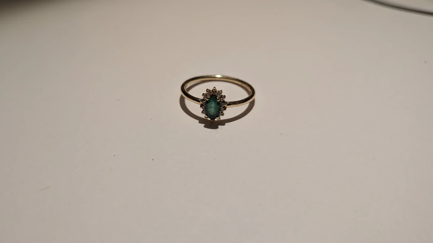 Selling a beautiful emerald and gold ring. It features a lovely green emerald surrounded by smaller diamond stones, set in a gold band. It's in great condition and ready to wear! Bought at 560 dollars.