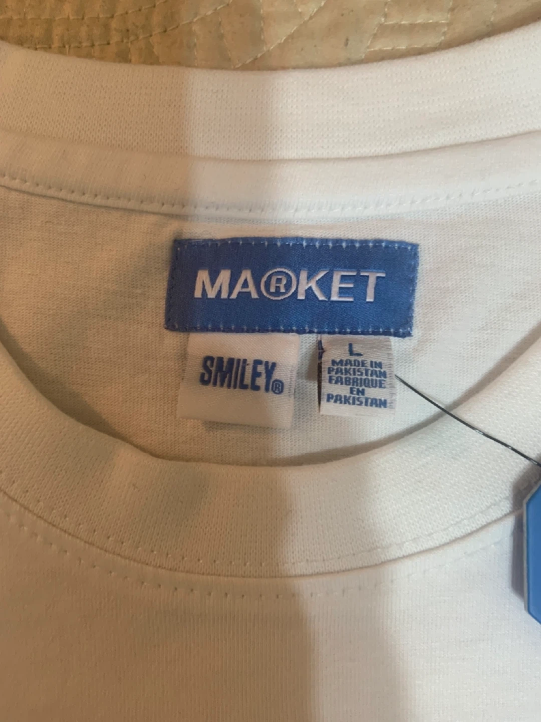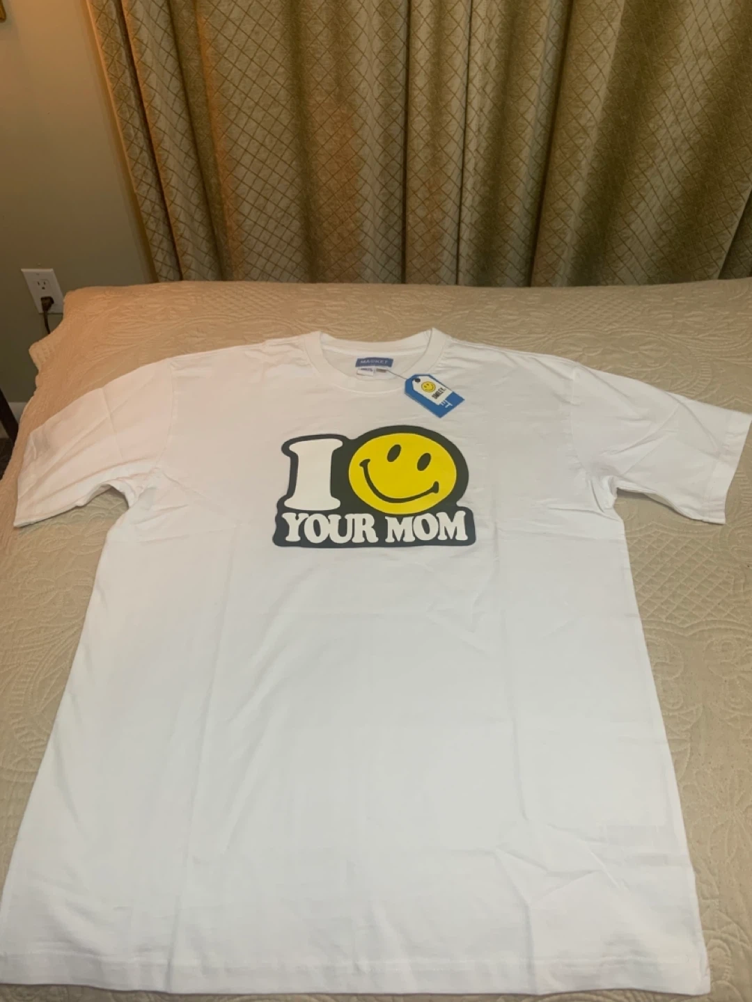 I'm selling a brand new MARKET x Smiley T-shirt! It's white and a size large. The design features the classic Smiley face with the words 'I ❤️ Your Mom'. It's still got the tags on it!