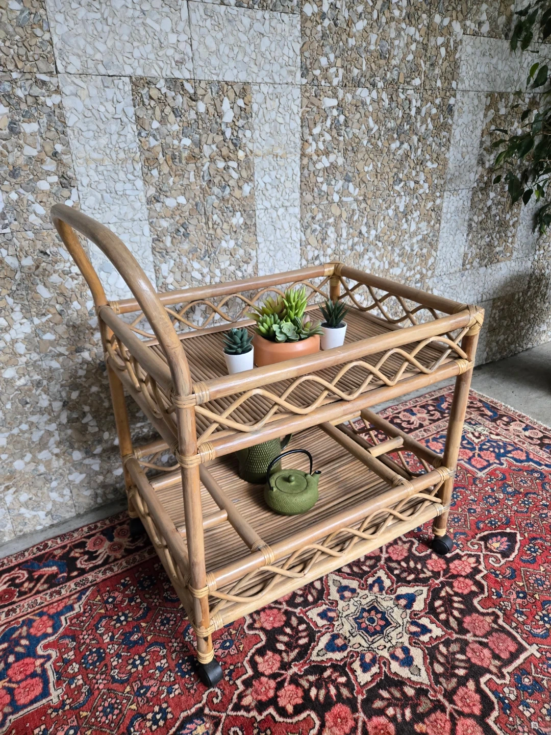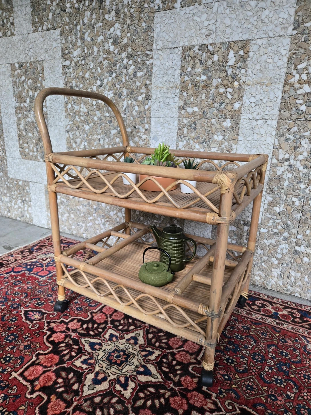 Vintage Bohemian Bamboo Two Tier Bar/Tea Cart On Wheels