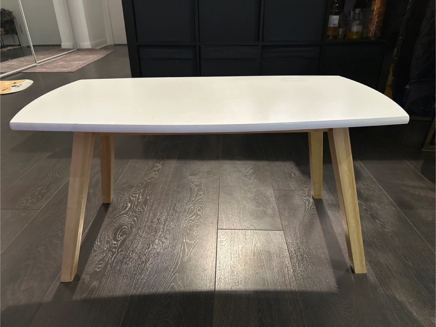 Selling a simple white coffee table! It has a clean, modern look with light wood legs. A small imperfection is visible on the top surface, as shown in the photos. Perfect for a living room or small space