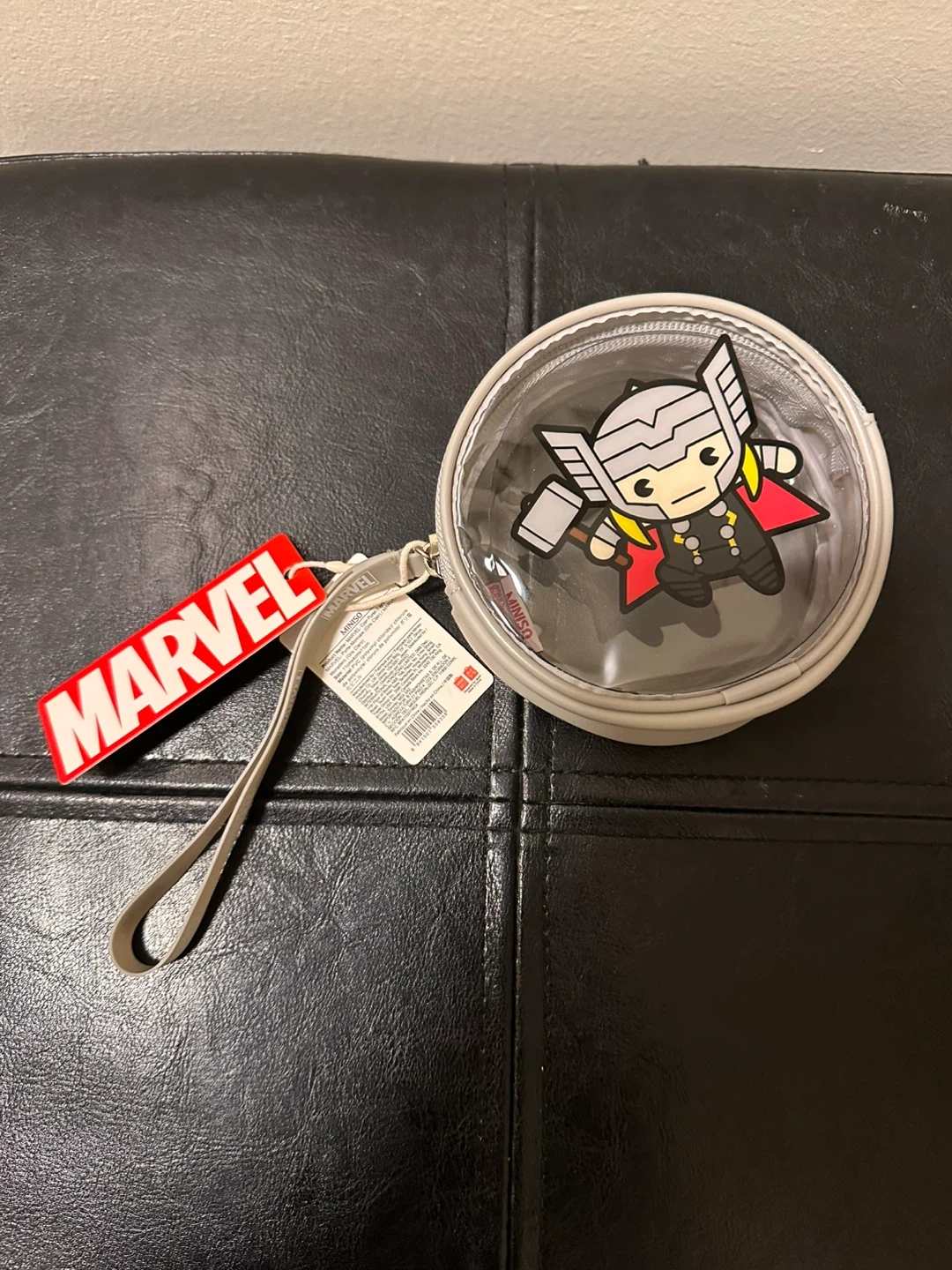 Super cute Miniso coin purse featuring Thor from Marvel! It's brand new and perfect for carrying your change or small items. The clear design lets you see what's inside at a glance!