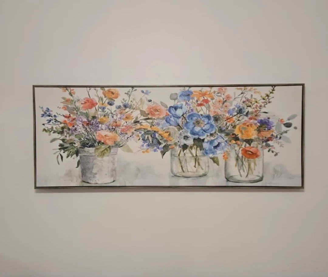 Beautiful floral print wall art, perfect for adding a touch of colour to any room! The print features a lovely arrangement of flowers in vases. It's in great condition and ready to brighten up your space