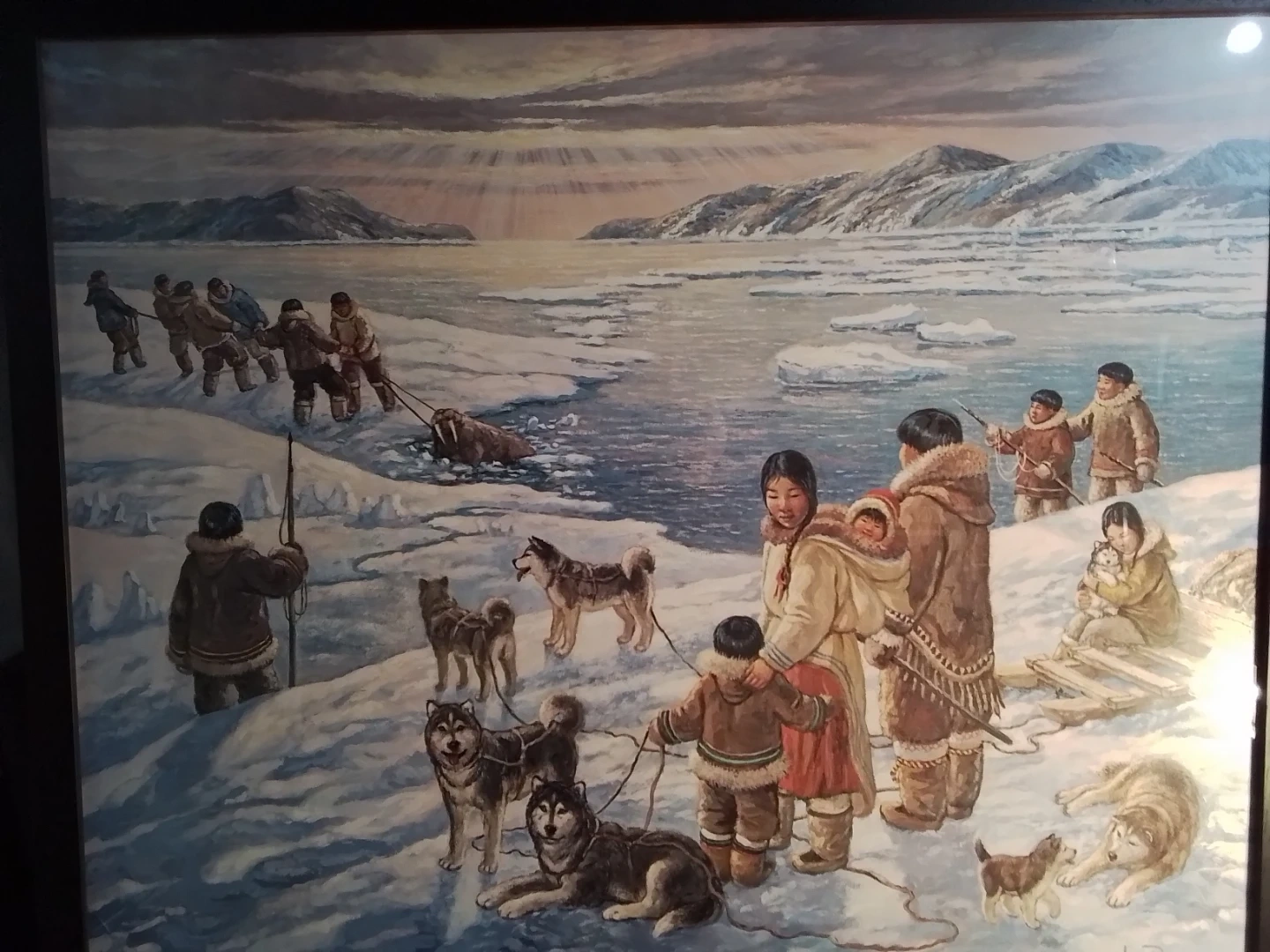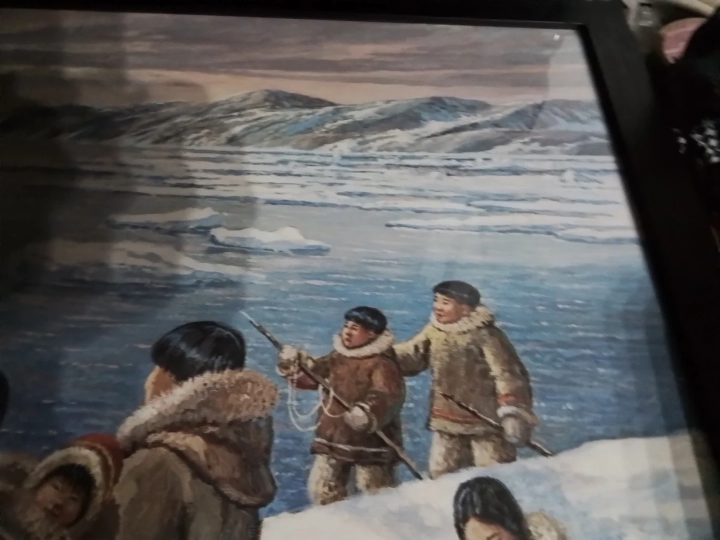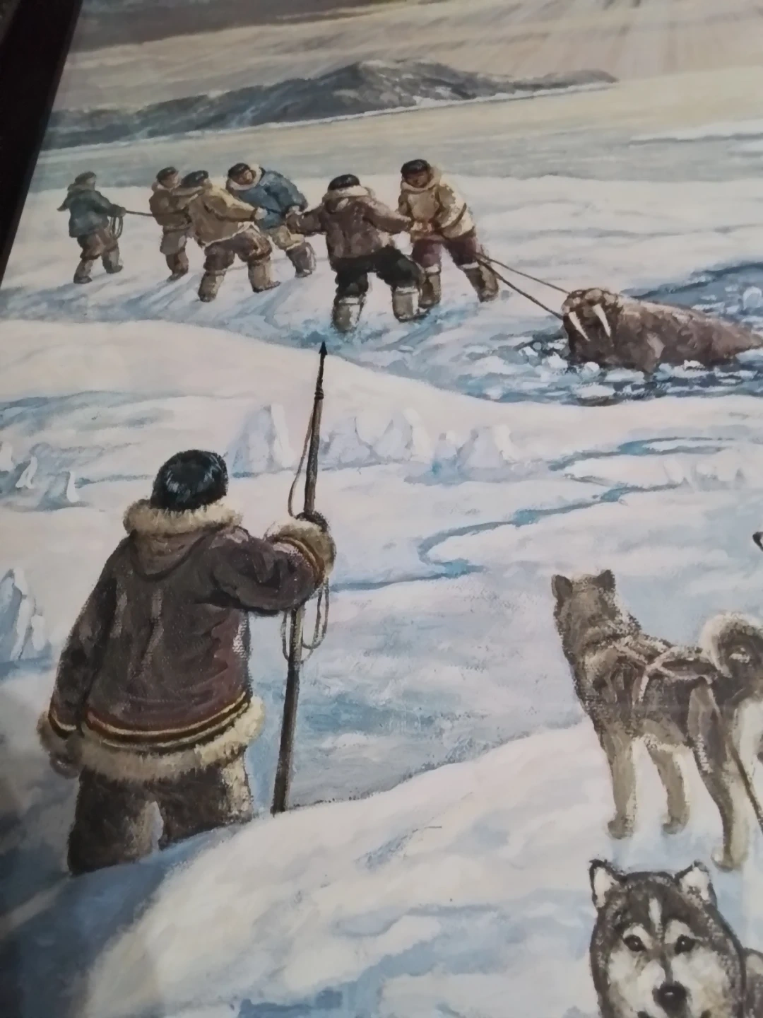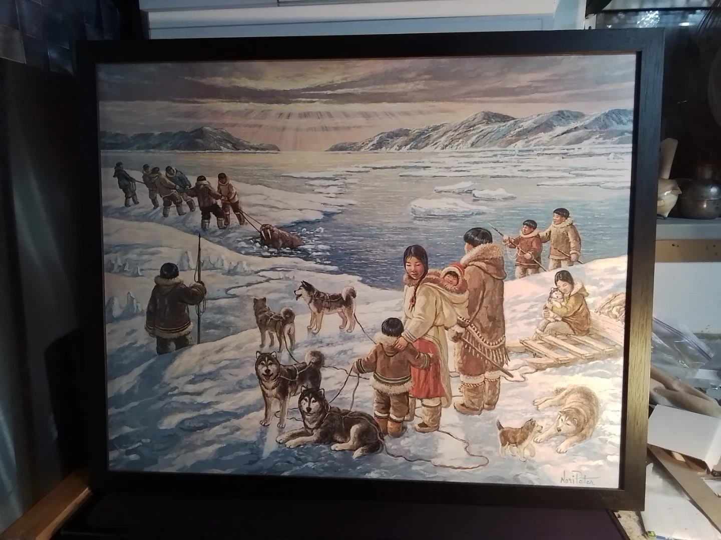 This is "The Providers" by Nori Peter, a captivating piece measuring 26 x 31.75 inches, beautifully framed and personally signed by the artist. The artwork portrays a vivid scene of Inuit life, showcasing a traditional walrus hunt amidst a stunning Arctic landscape. Please note that this artwork is used, adding to its unique character and history.
