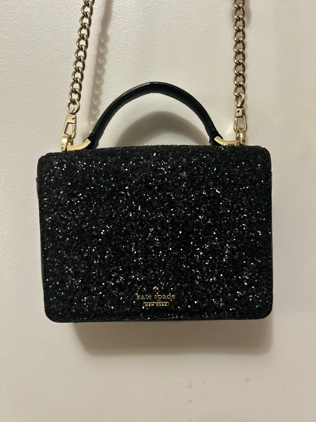 Selling a Kate Spade New York handbag in black glitter. It's in perfect conditions! It features a chain strap and a top handle. DM for more pictures!!!