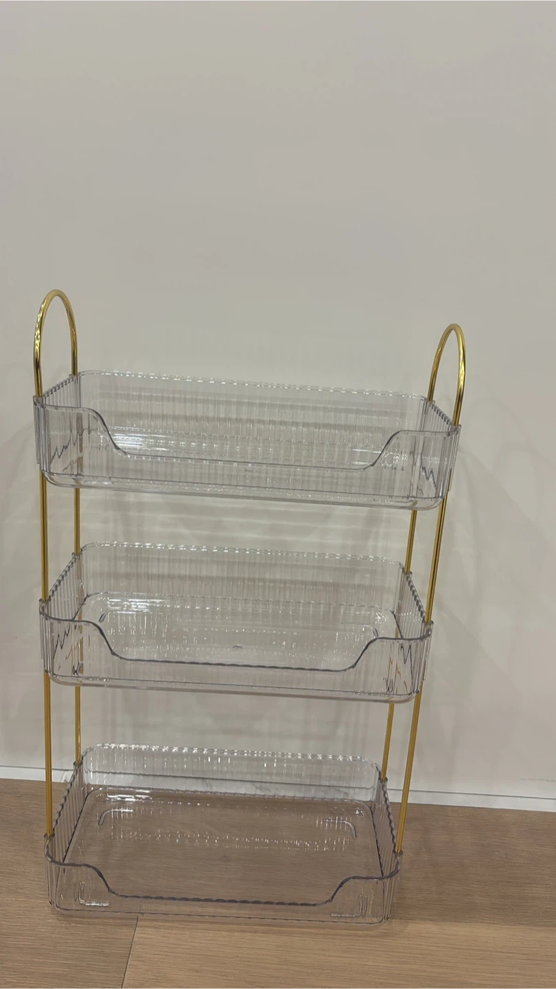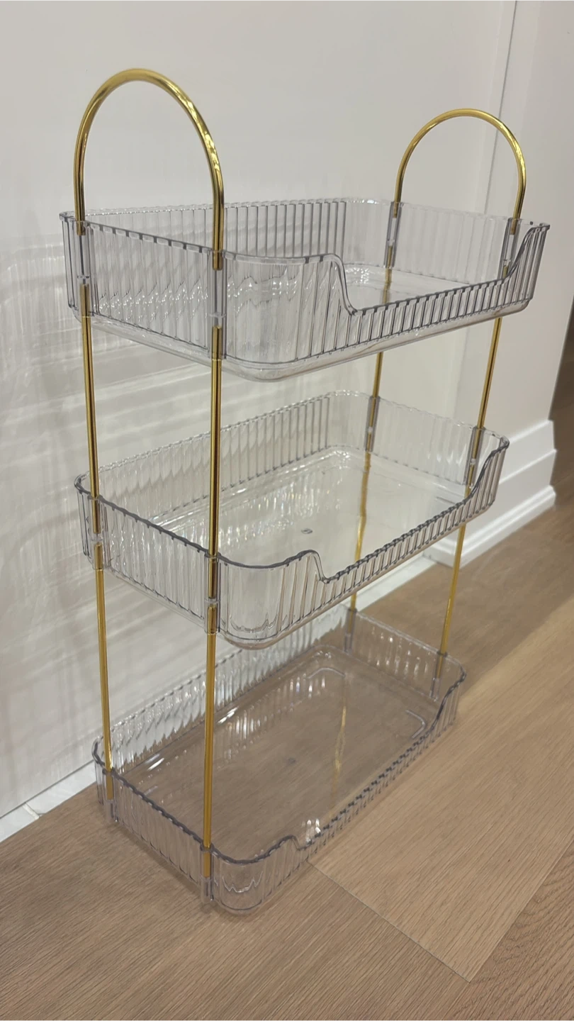 Declutter your space with this stylish 3-tier cosmetic organizer! It features a gold frame and clear trays, perfect for storing makeup, skincare, or other small items. It's in great condition and ready to help you get organized