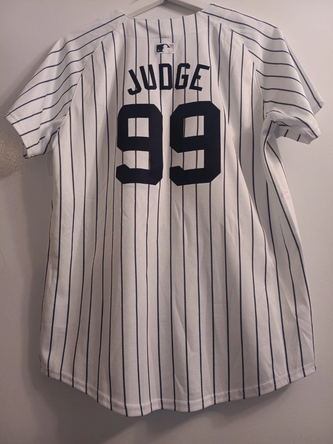 Selling a brand new New York Yankees Aaron Judge jersey in size L (14/16). It has the classic pinstripe design and the iconic Yankees logo. The jersey is made by Nike and still has the original tag attached.