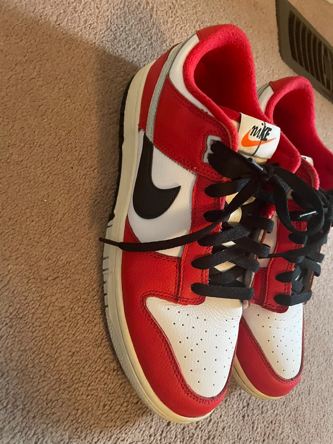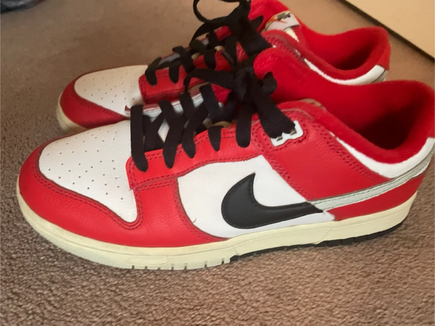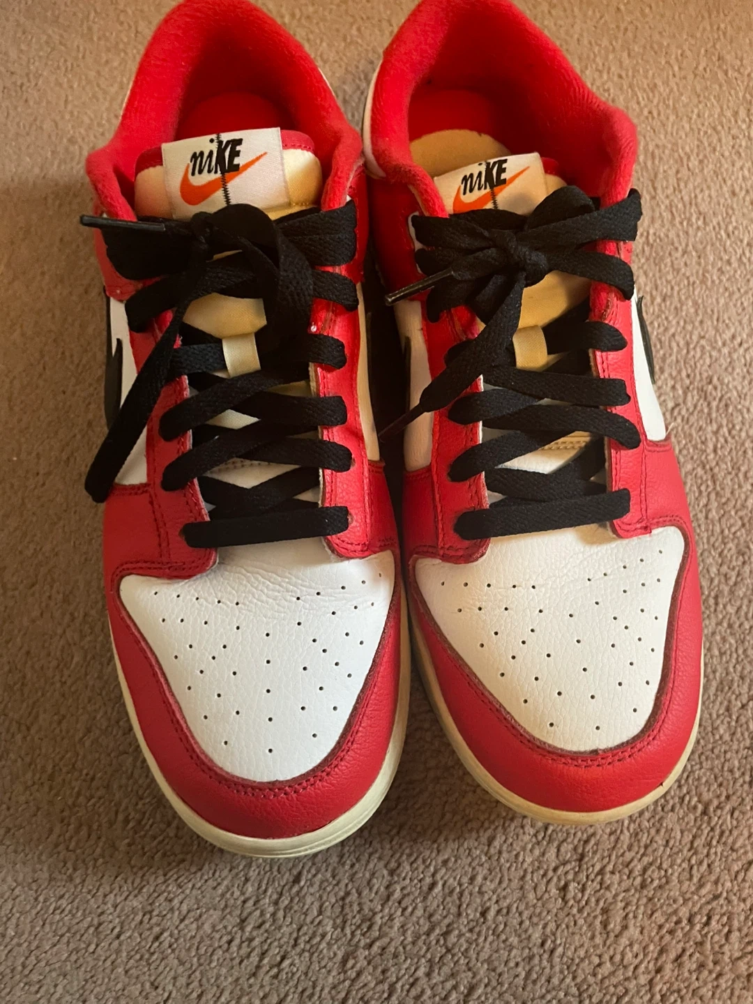 Selling a pair of Nike Dunk Low sneakers in a red and white colourway. These are in good condition and ready for a new owner. Theirs no box