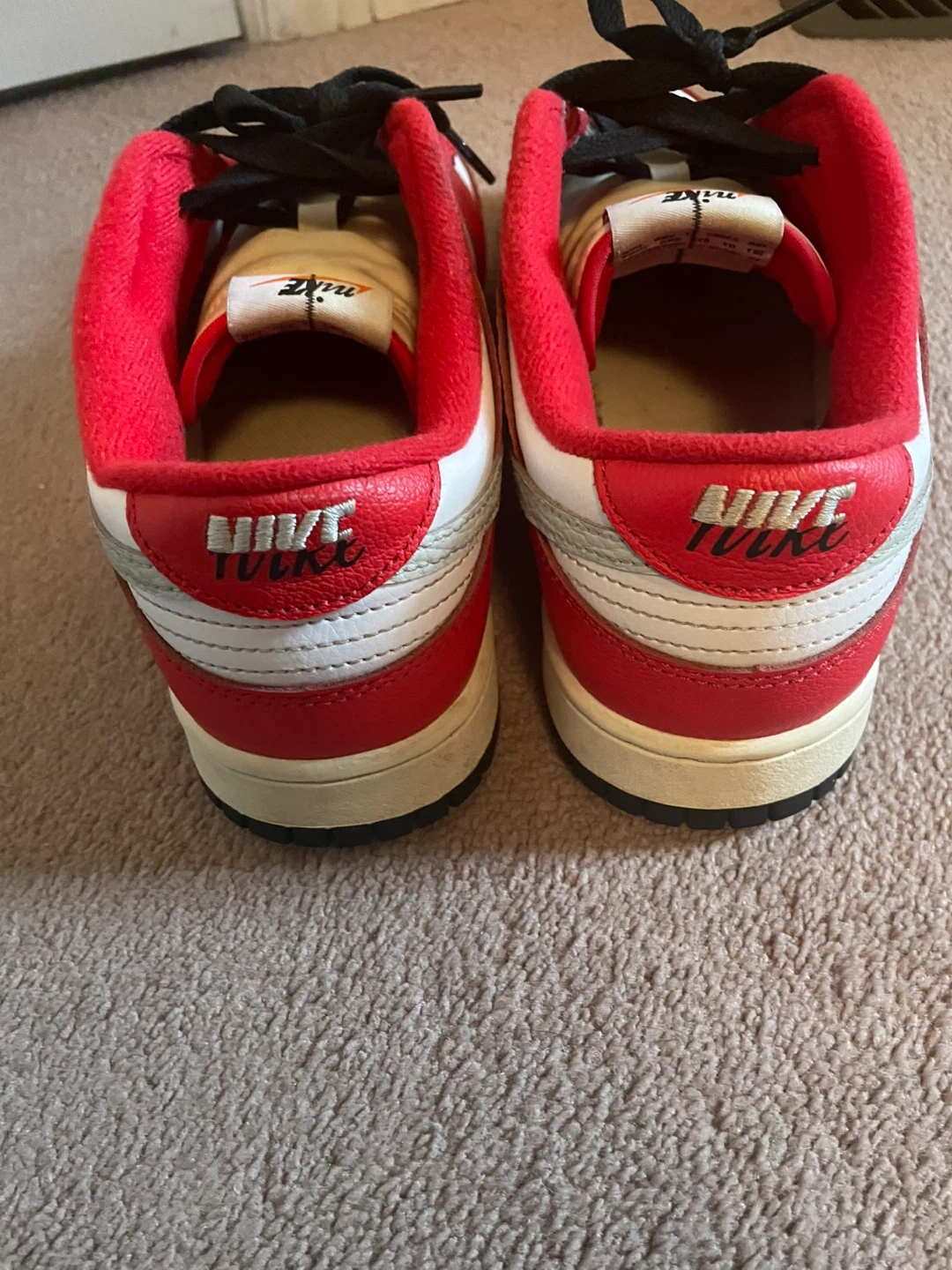 Selling a pair of Nike Dunk Low sneakers in a red and white colourway. These are in good condition and ready for a new owner. Theirs no box