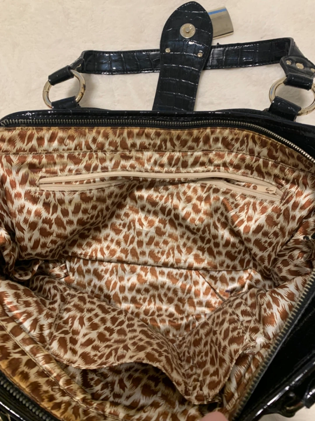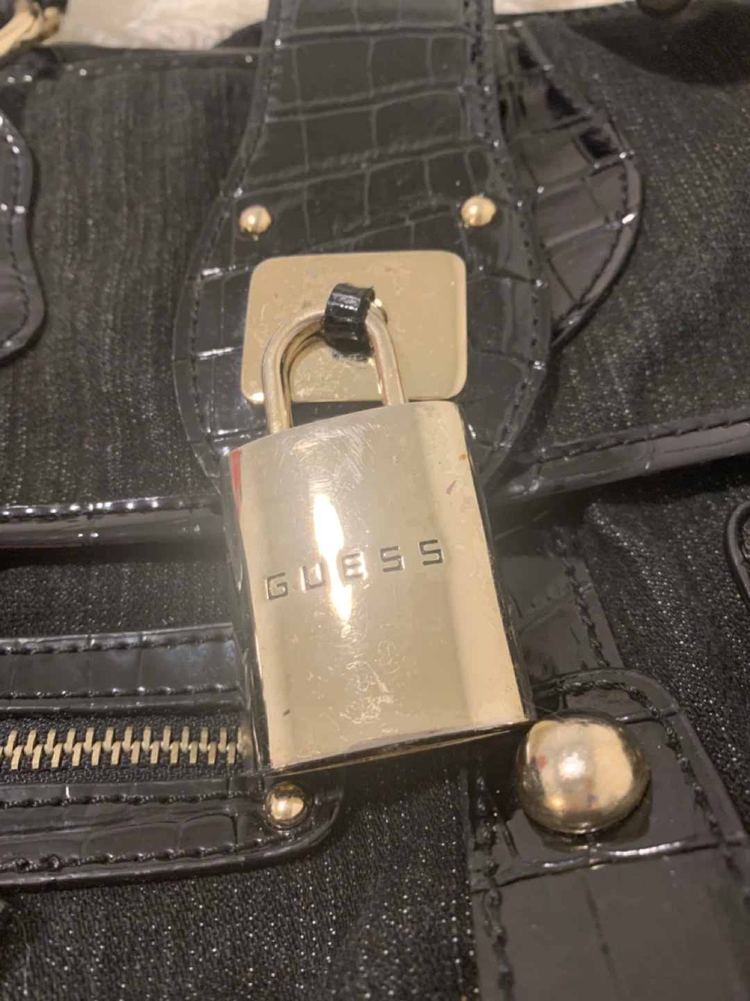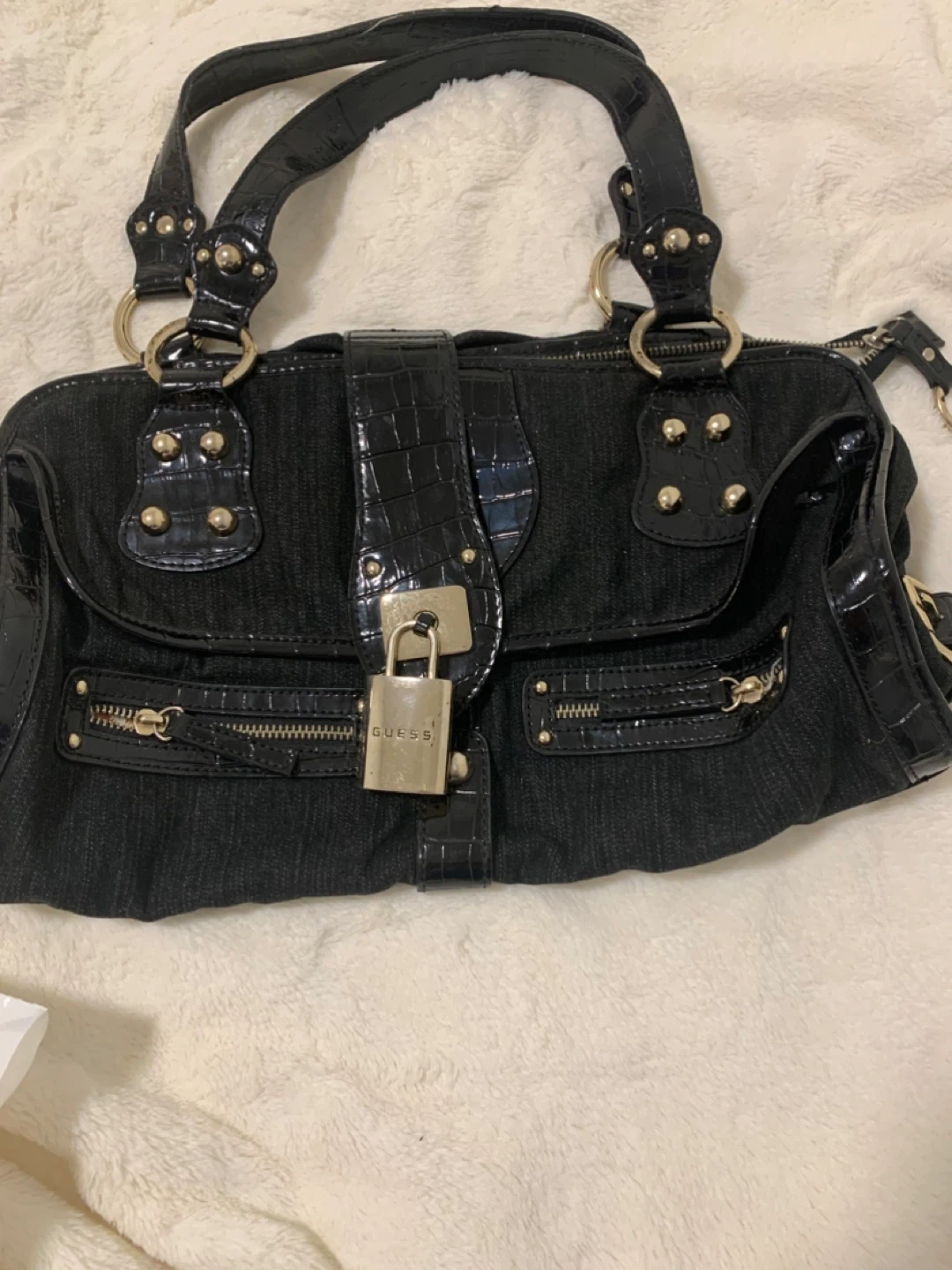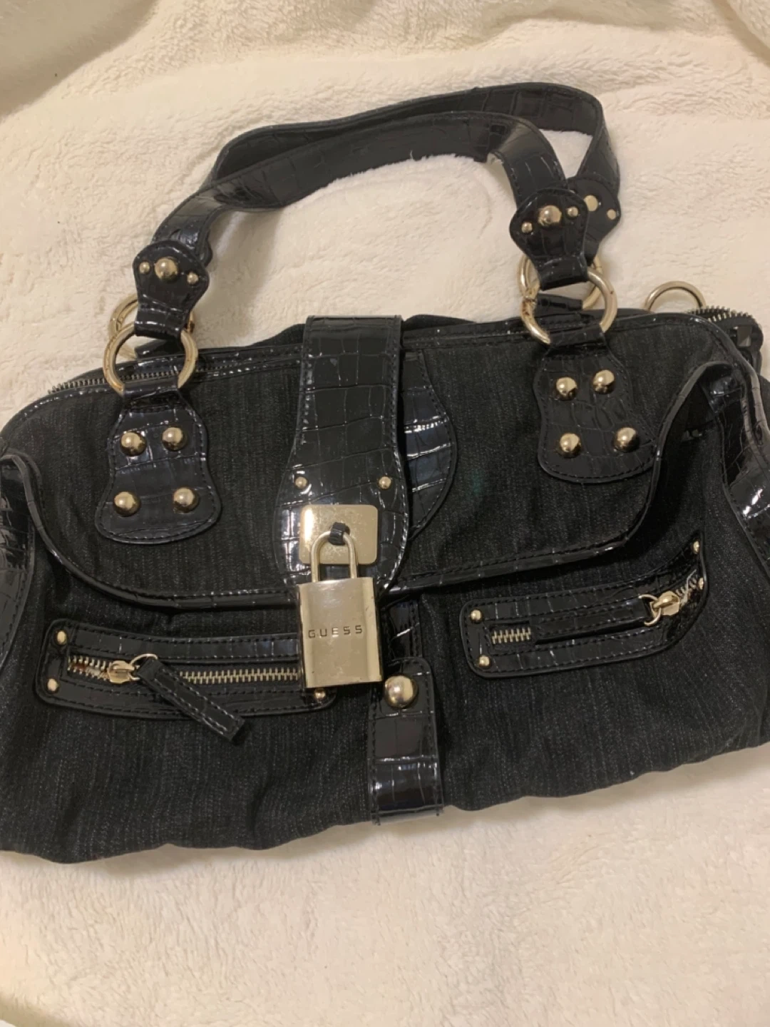 Selling a Guess shoulder bag in black denim with faux crocodile accents. It features silver hardware and a leopard print lining. The bag is in good condition and ready for a new owner! Inside the purse one zipper is not closing