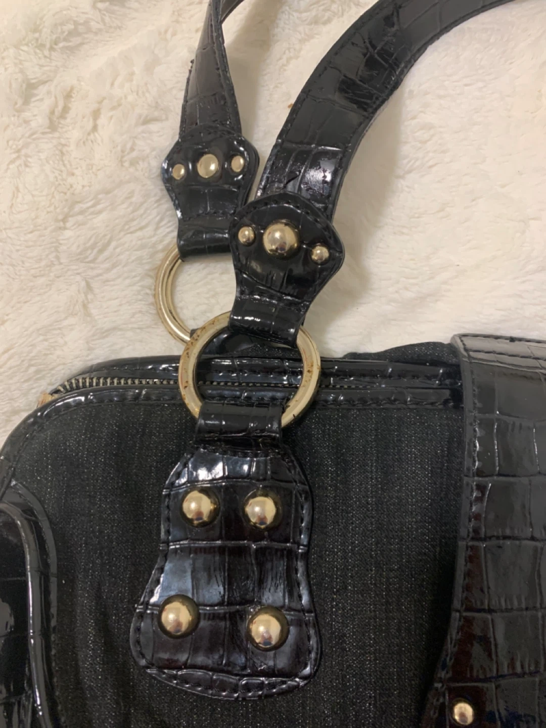 Selling a Guess shoulder bag in black denim with faux crocodile accents. It features silver hardware and a leopard print lining. The bag is in good condition and ready for a new owner! Inside the purse one zipper is not closing