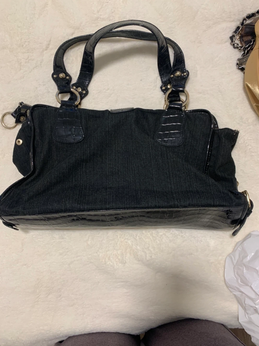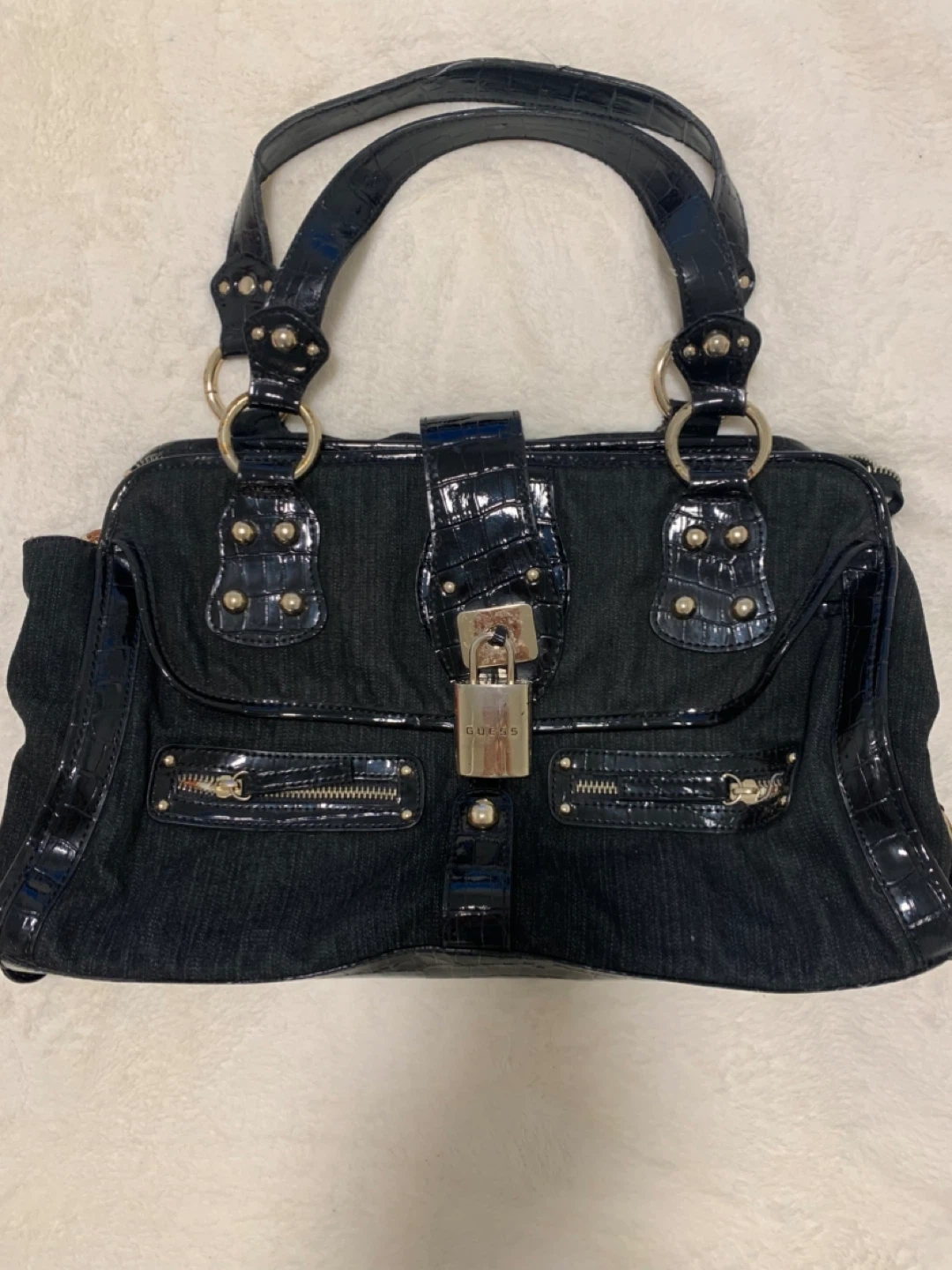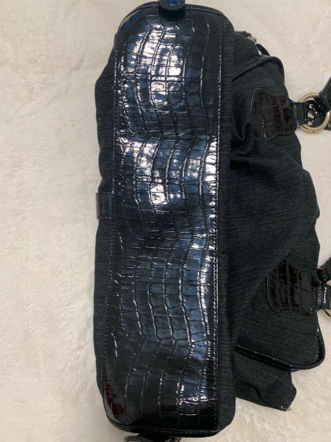 Selling a Guess shoulder bag in black denim with faux crocodile accents. It features silver hardware and a leopard print lining. The bag is in good condition and ready for a new owner! Inside the purse one zipper is not closing