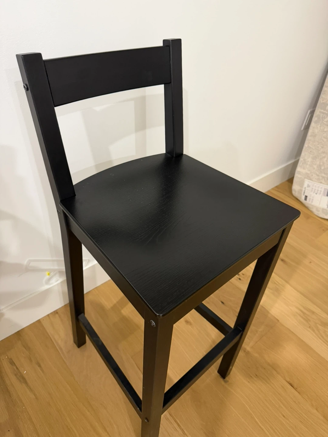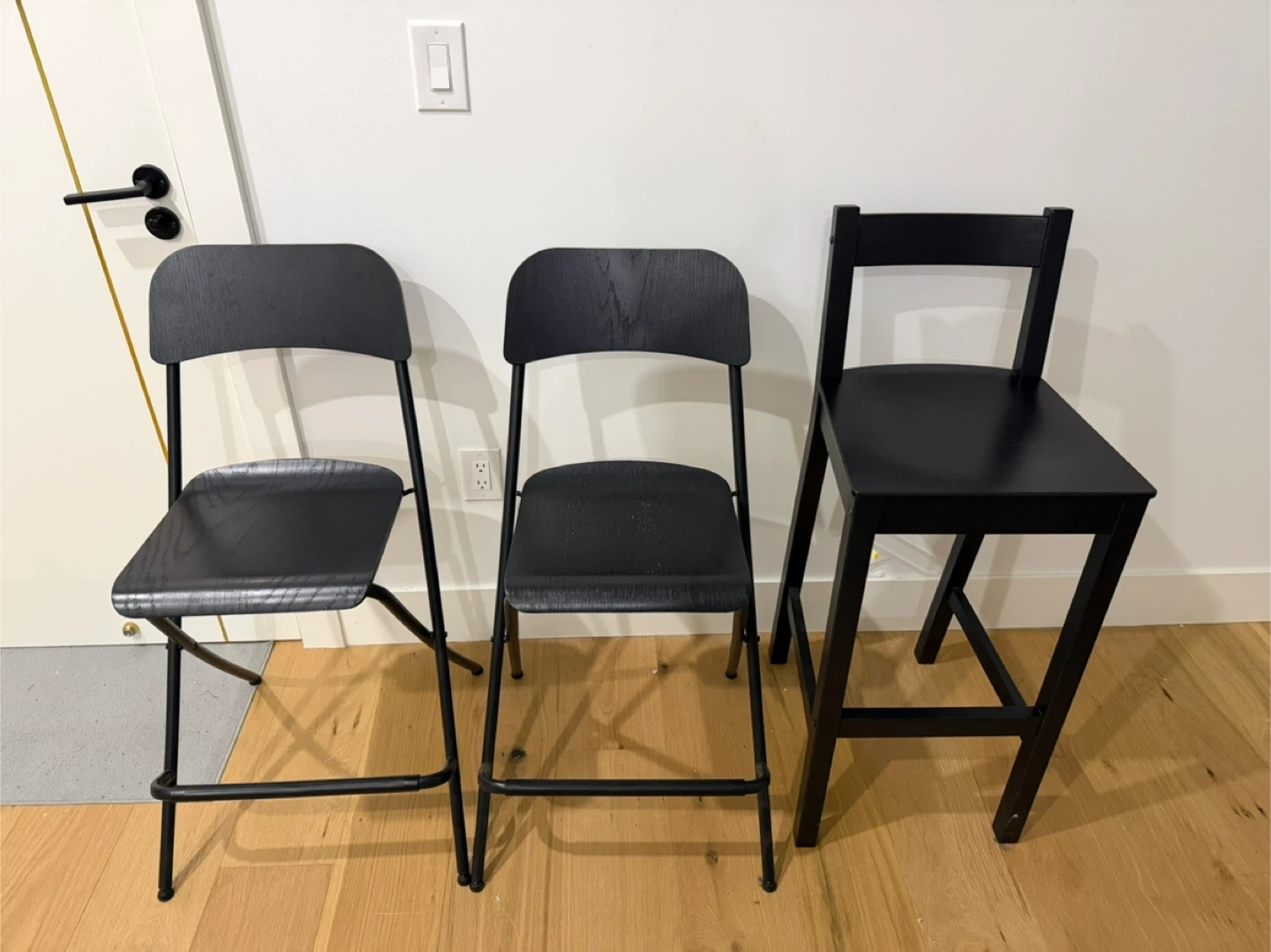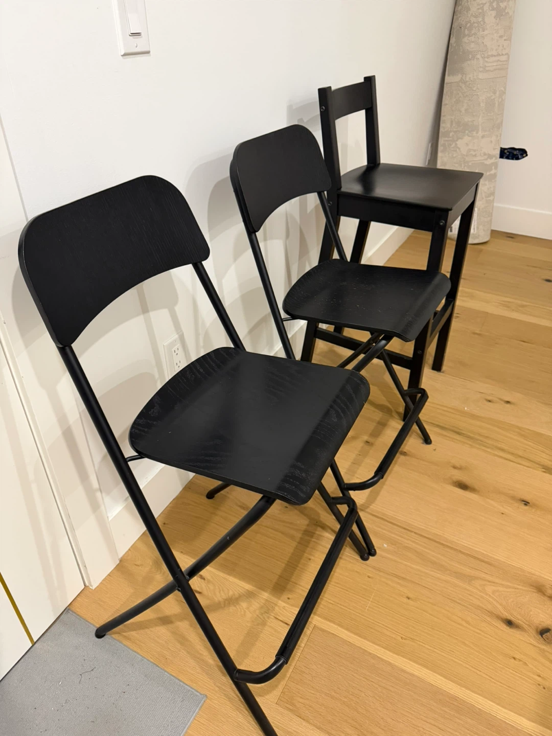 Selling a set of black folding chairs and a bar stool. They're in good condition and ready for a new home! Perfect for extra seating or a small space
