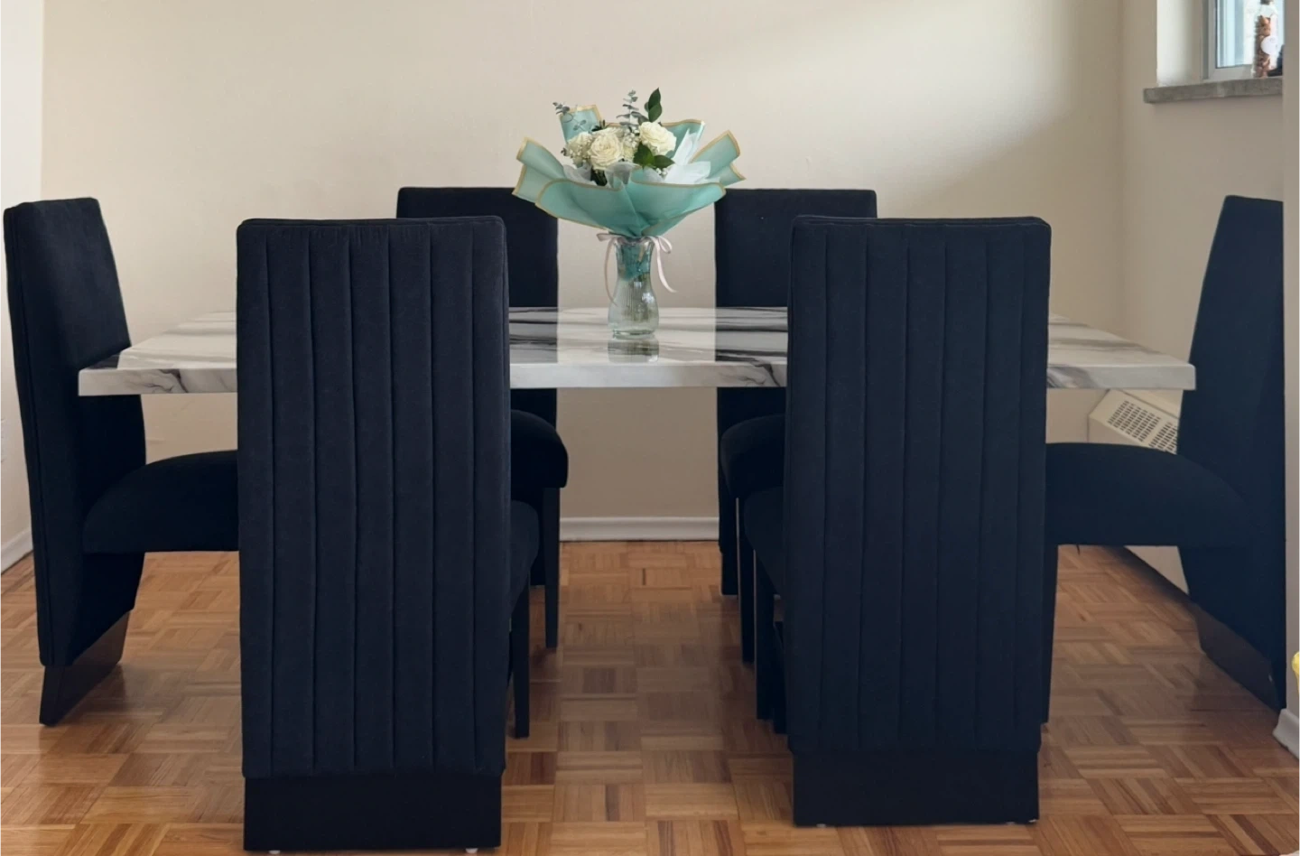 Selling a dining table set with 6 black velvet chairs. The table has a marble-like top and the chairs are a sleek, modern design. Perfect for a dining room!