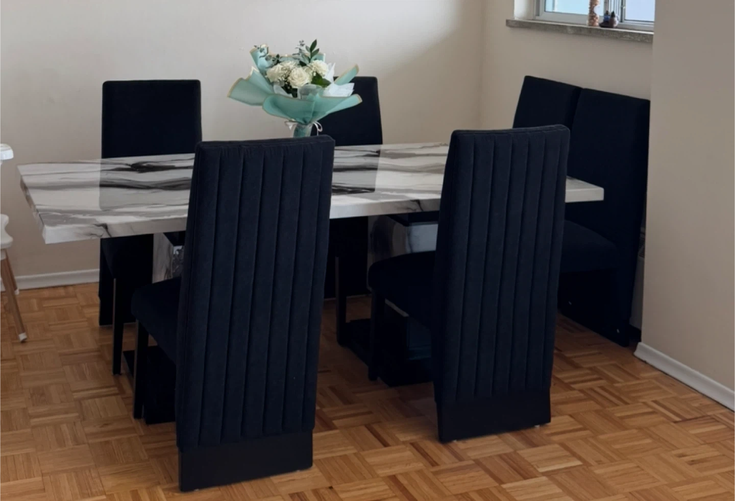 Selling a dining table set with 6 black velvet chairs. The table has a marble-like top and the chairs are a sleek, modern design. Perfect for a dining room!