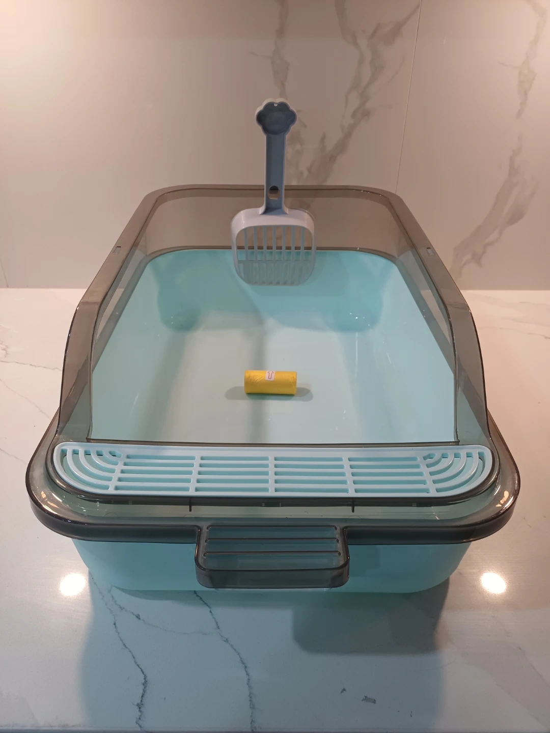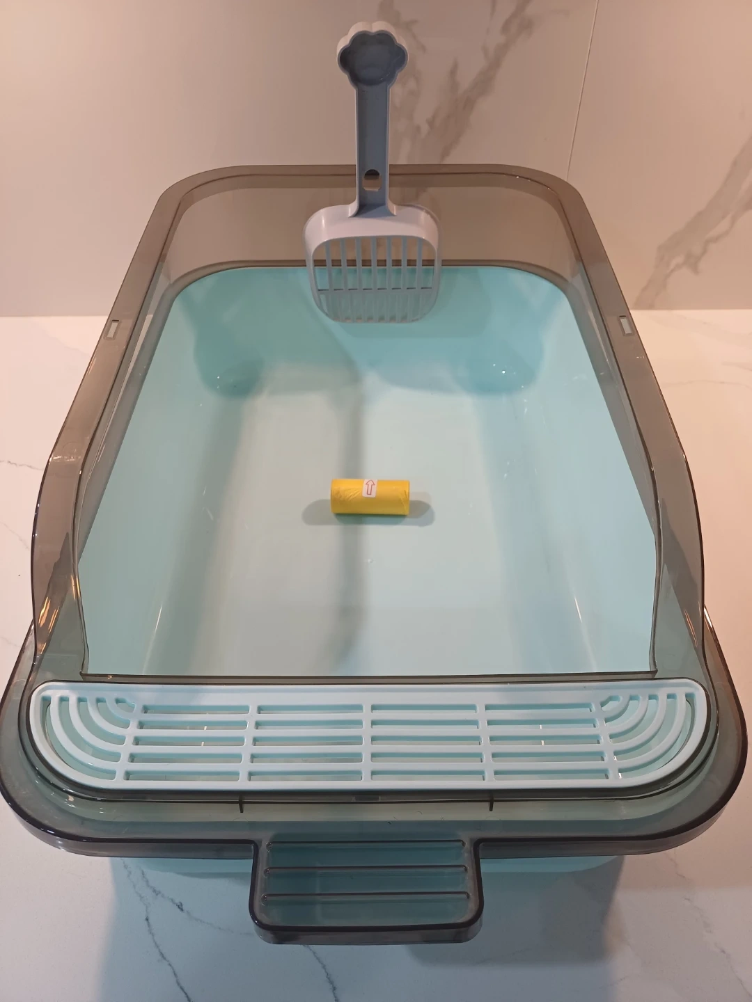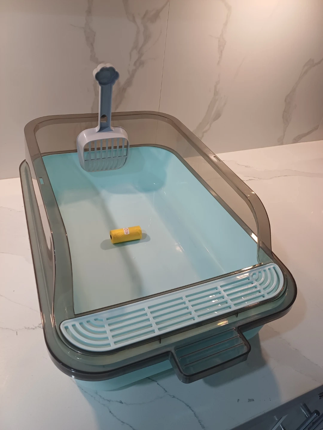 It is made of PP plastic material and has a high sided design to help prevent litter from splashing.