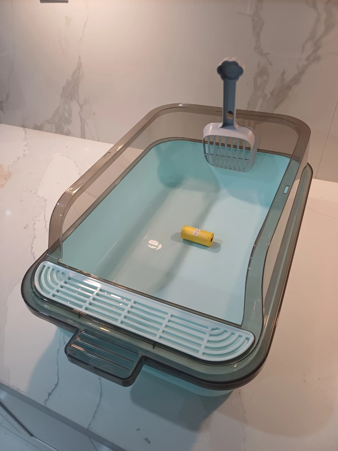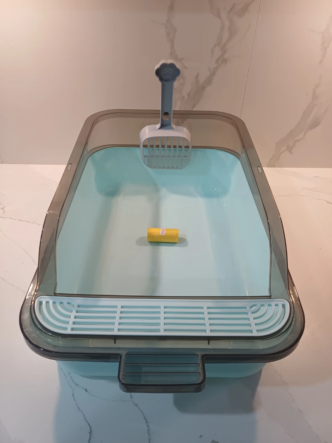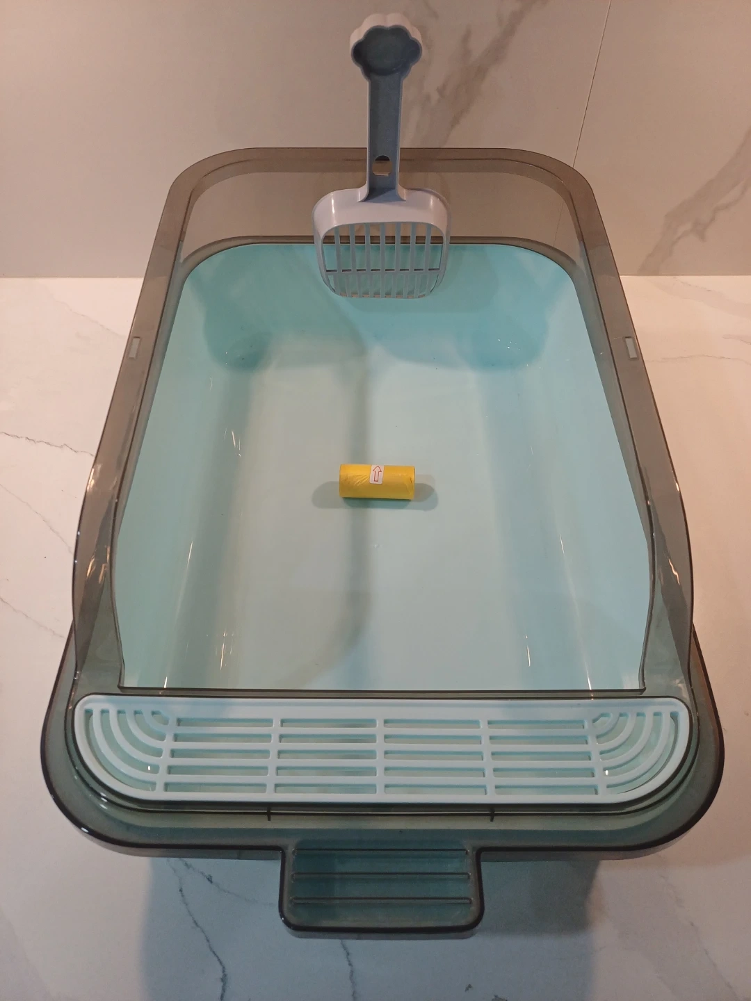 It is made of PP plastic material and has a high sided design to help prevent litter from splashing.