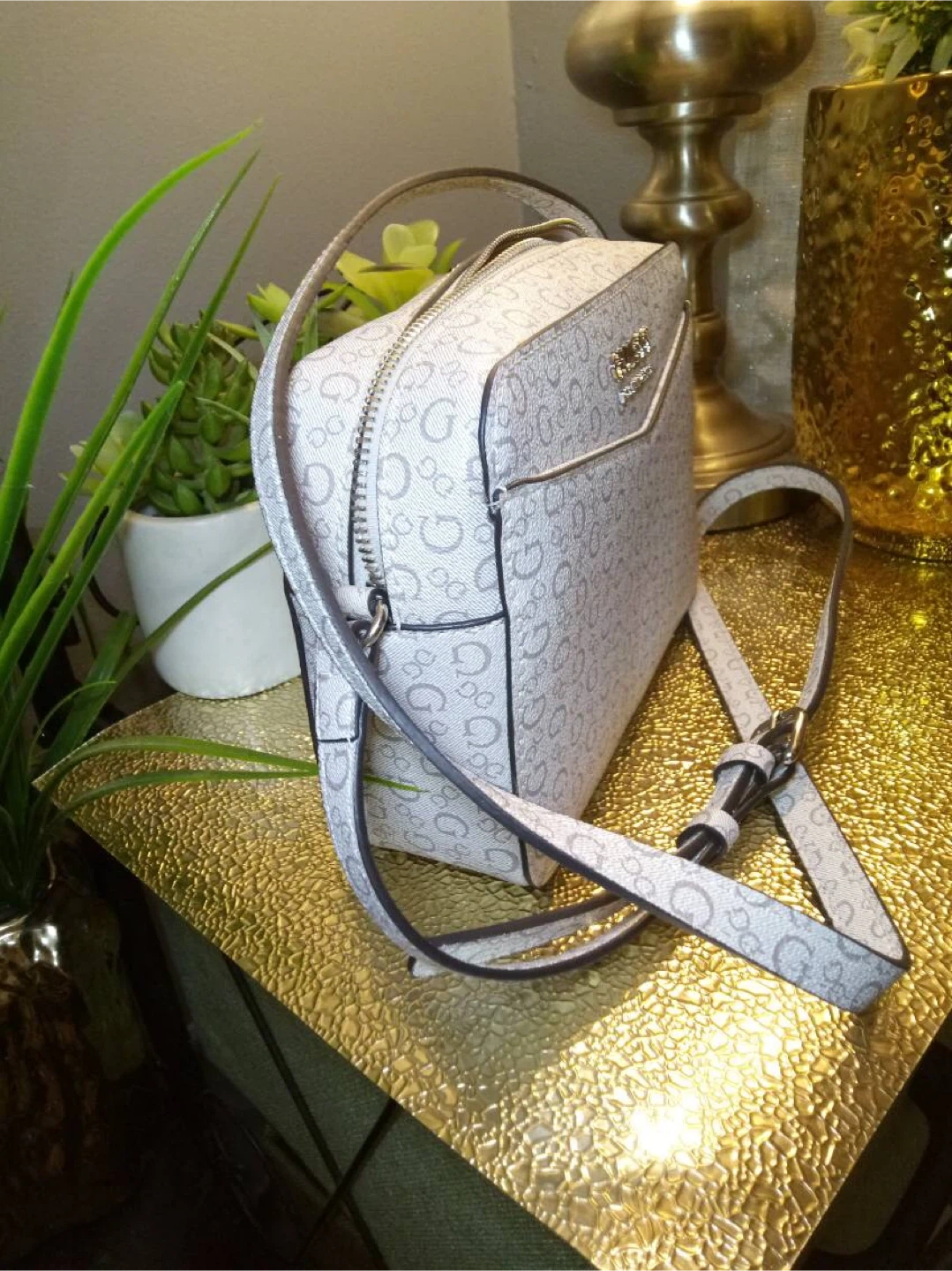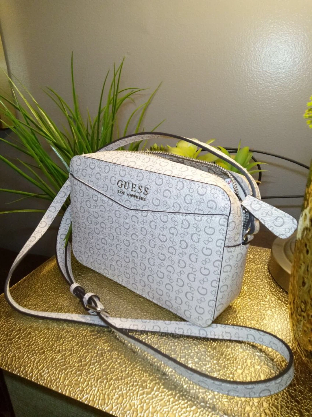 This Guess crossbody bag features an all-over G logo print. It has a zip closure and an adjustable shoulder strap. Perfect for everyday use!
