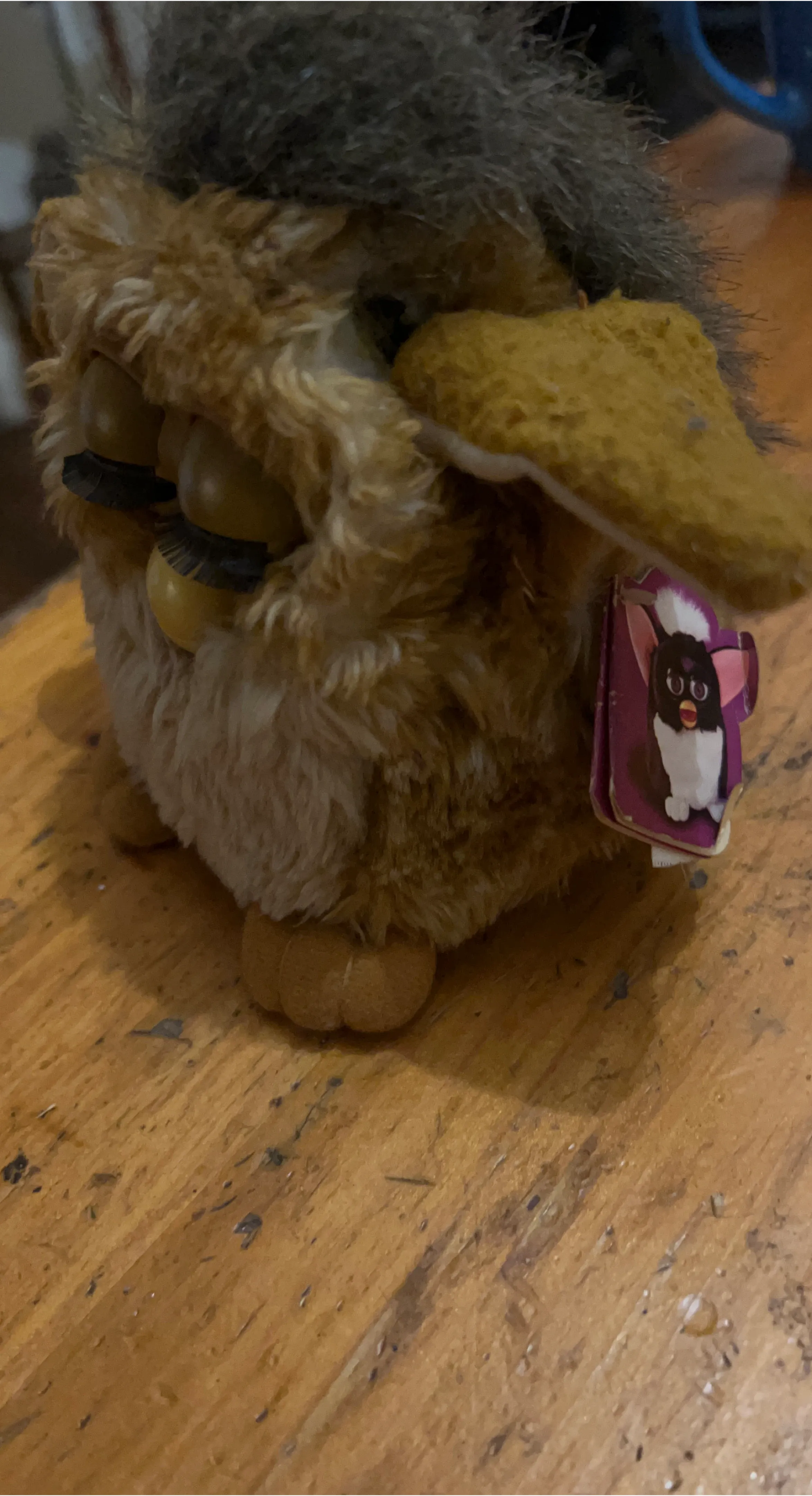 Selling a vintage Furby plush toy! It's in good condition and would make a great addition to any collection. It has a tag on it with a picture of a Furby.