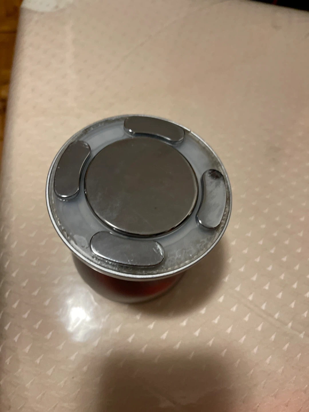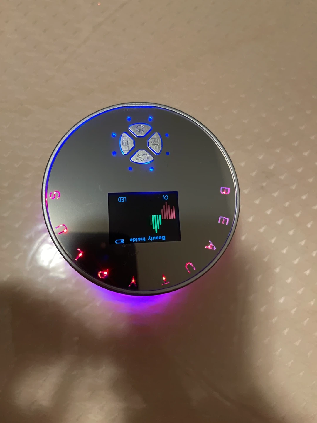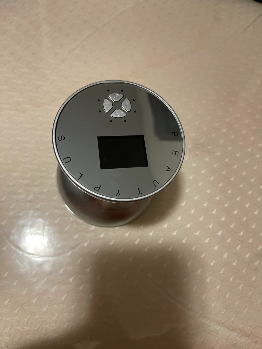 Portable ultrasonic cavitation machine by Beauty Plus with a sleek metallic design and touch-sensitive LED control panel. The device is fully functional and comes with its charger and a small bottle of gel. It features a digital display and simple controls for adjusting settings. Please note there is a small crack on the exterior, which does not affect performance. Compact, modern, and easy to store for home aesthetic or body-care use.