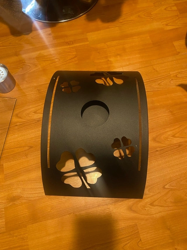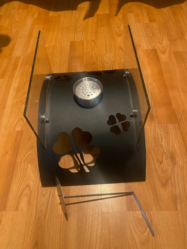 Modern bio ethanol fireplace insert. Black metal housing with clover cutouts. Includes glass panels and burner. Indoor and outdoor Easy installation.