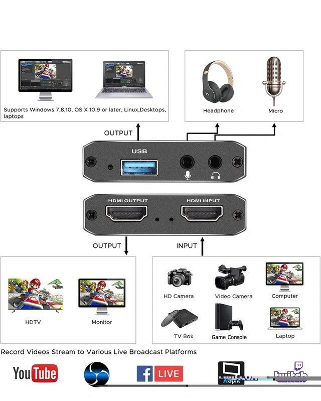 USB capture card. Records videos and streams to various live broadcast platforms. Includes HDMI input and output. Supports Windows, OS X, and Linux. Compact design. Great for gaming, streaming, and more.